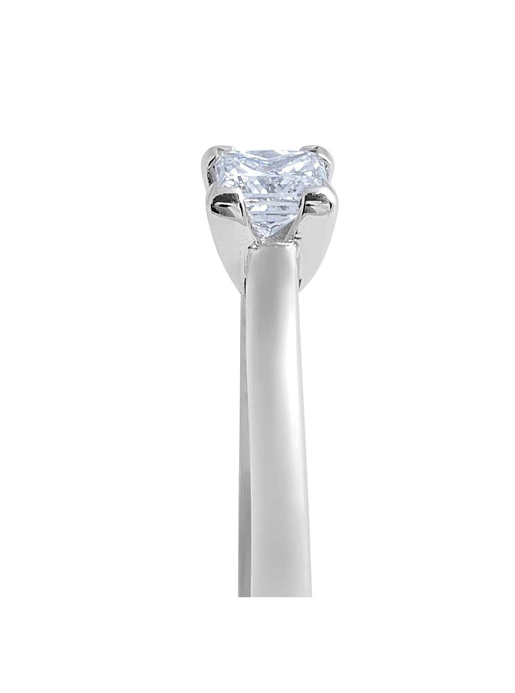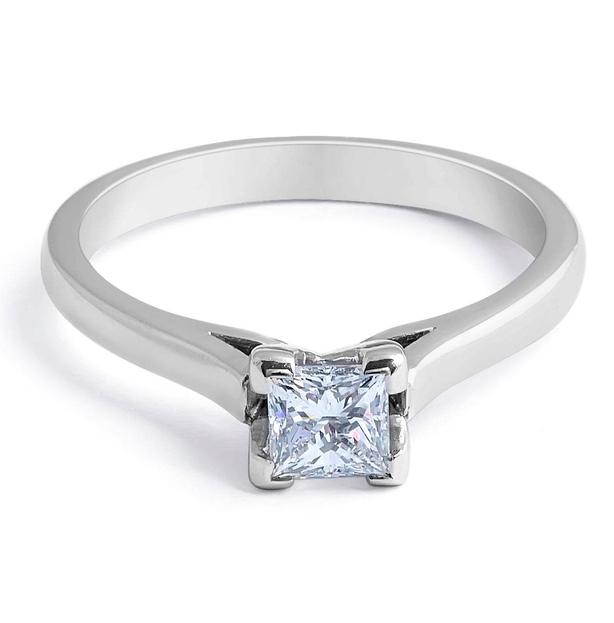 A modern 18K white gold engagement ring with a 0.50 Carat princess cut centre diamond. The ring radiates perfection and the perfect colour will not go unnoticed. Gently tapered shape of the band complements the shape of the diamond in a secure elevated 4 claw setting. This ring is a winner for a woman who is all about understated modern simplicity.