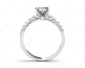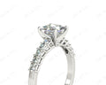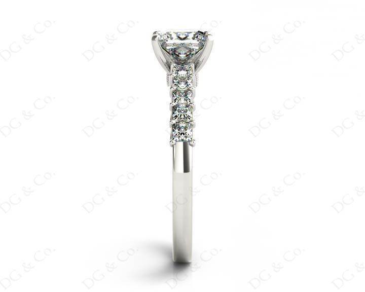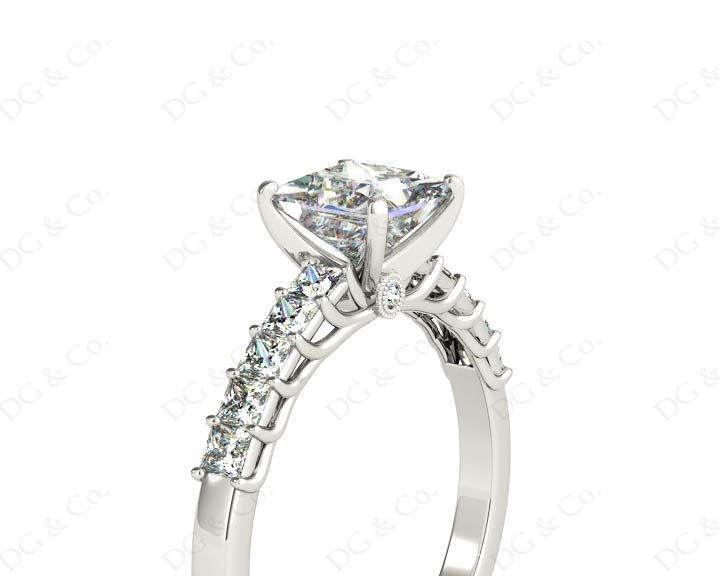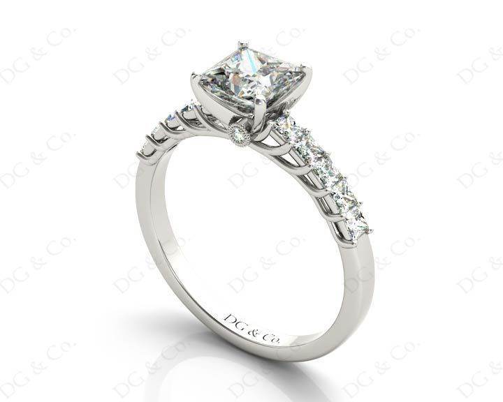 Princess Cut Four Claw Set Diamond Engagement Ring with Princess Cut Stones Claw Set Down the Shoulders and Brilliant Grain Set Stones on Both Sides.