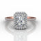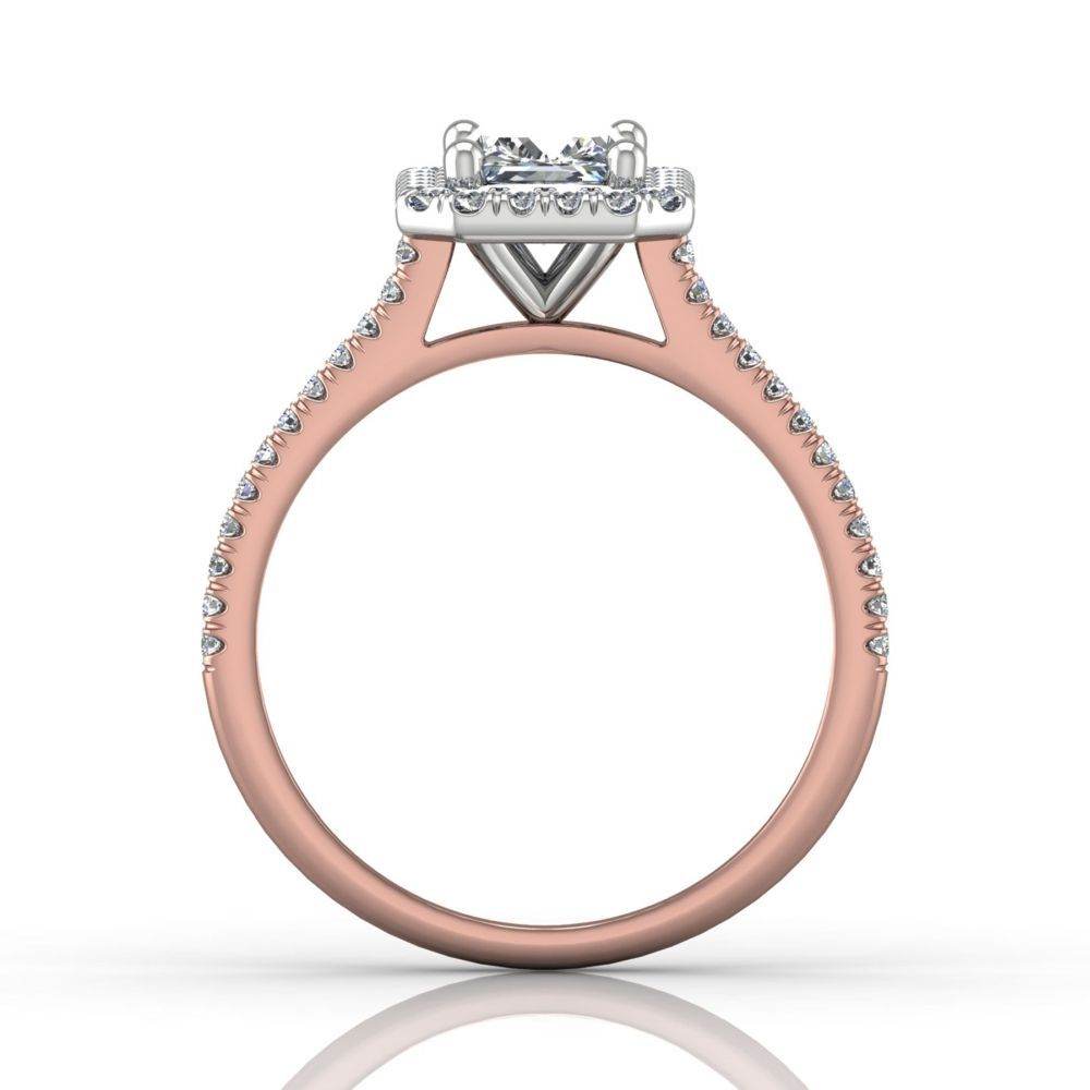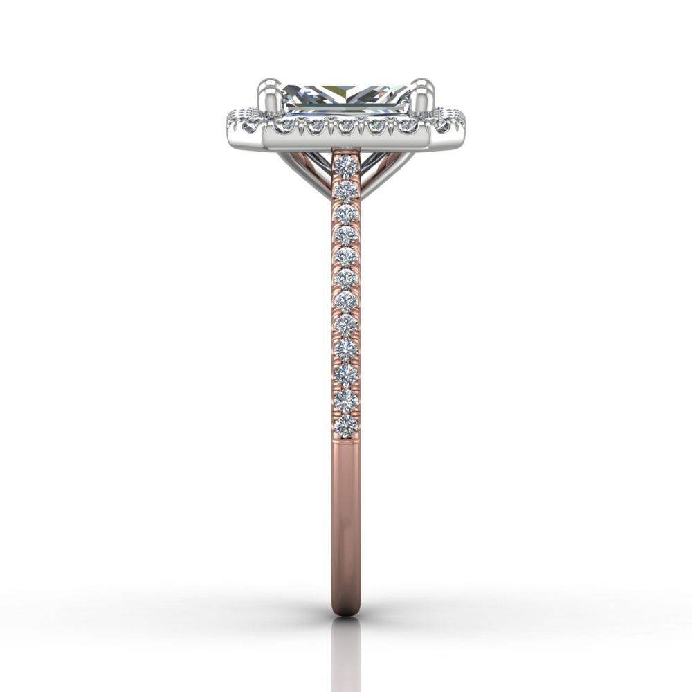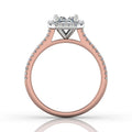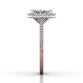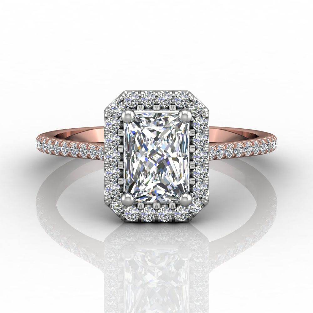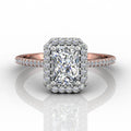 Capture the moment with this radiant cut diamond engagement ring, featuring a pave set diamond halo and your choice of centre diamond.