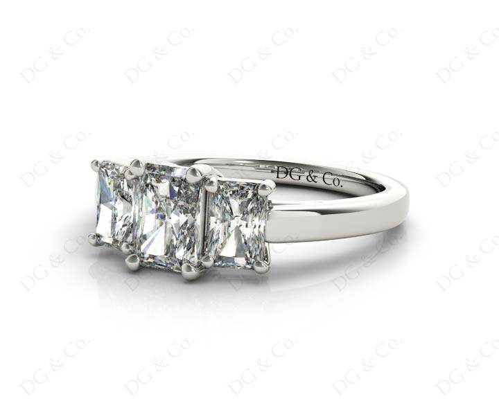 Three-stone engagement ring with three radiant cut diamonds in four claw settings with a slightly rounded band.