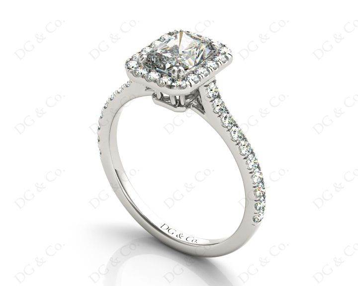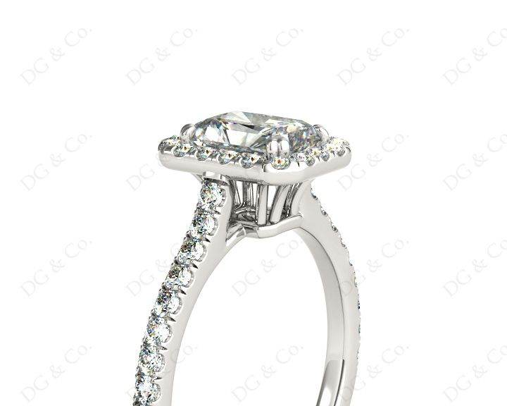 Halo Diamond Engagement Ring with Radiant Cut Diamond in Four Claws Setting with Thirty- Eight Round Brilliant Pave Setting around the Centre Stone and Down the Shoulders.