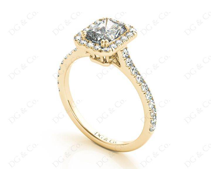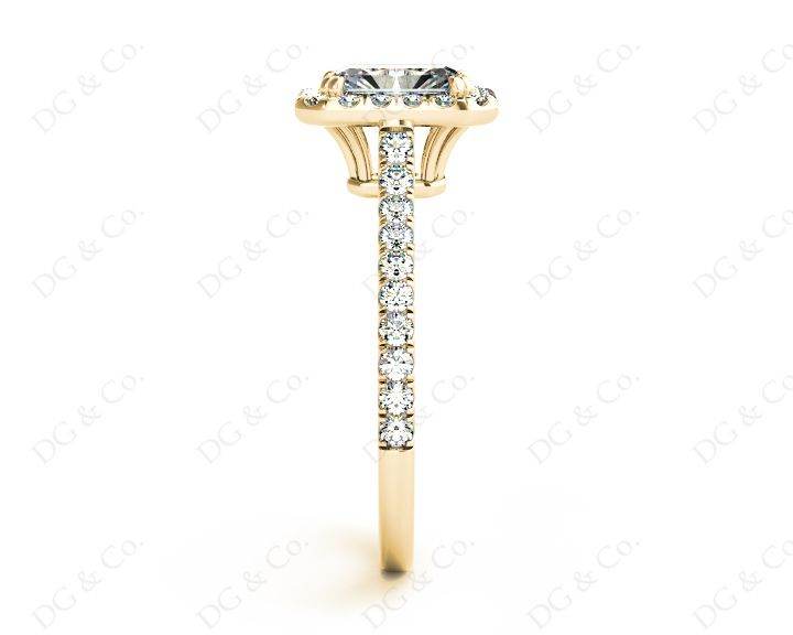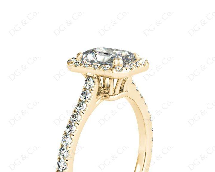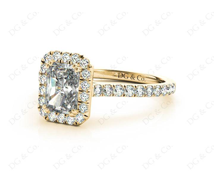 Halo Diamond Engagement Ring with Radiant Cut Diamond in Four Claws Setting with Thirty- Eight Round Brilliant Pave Setting around the Centre Stone and Down the Shoulders.