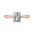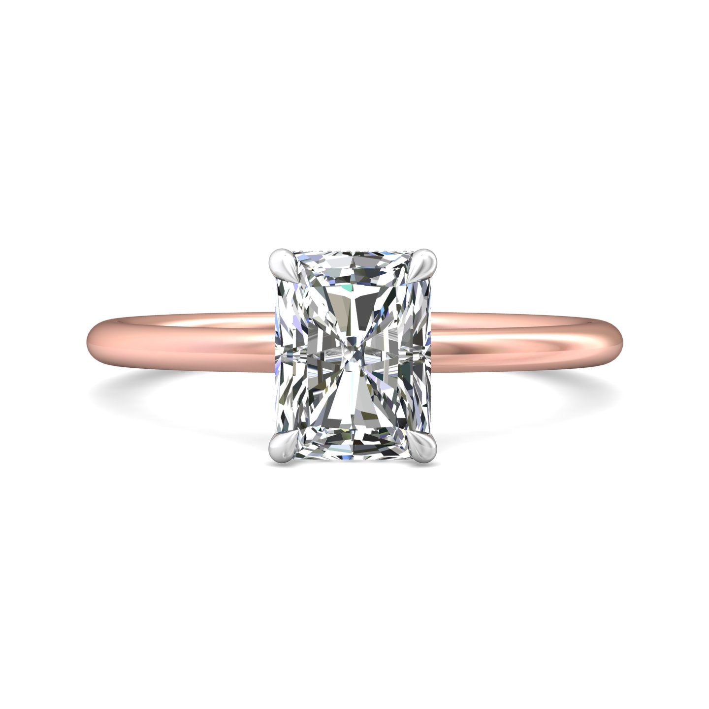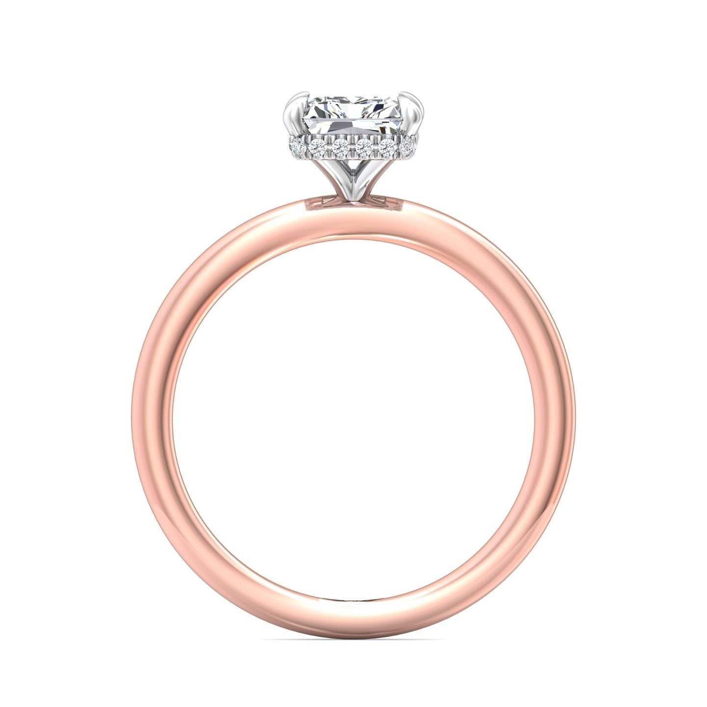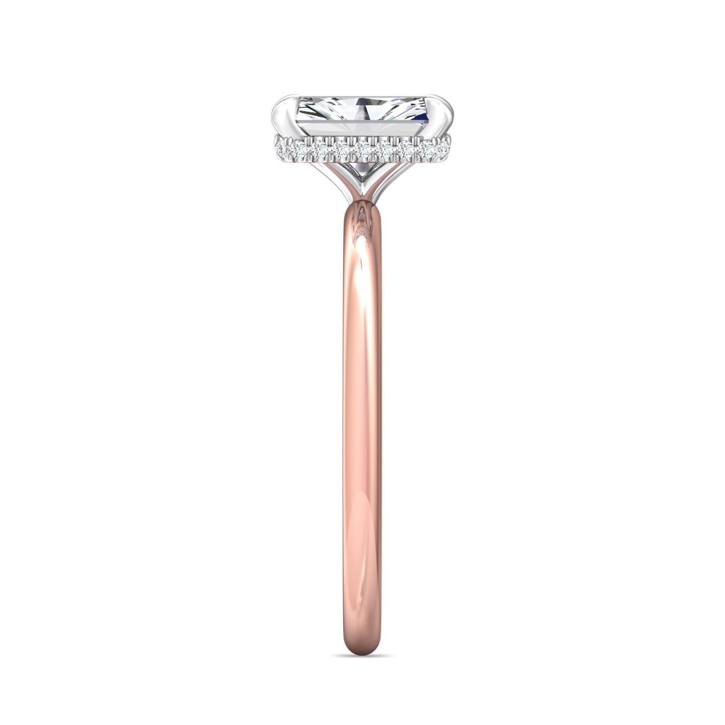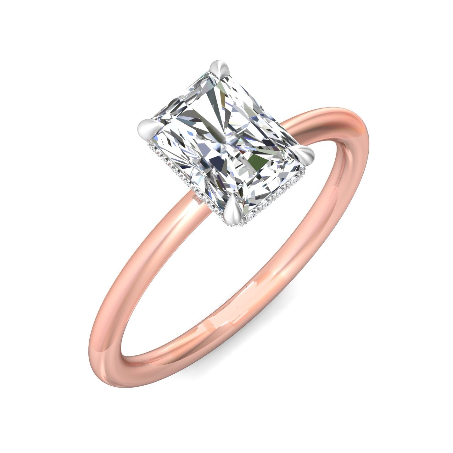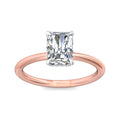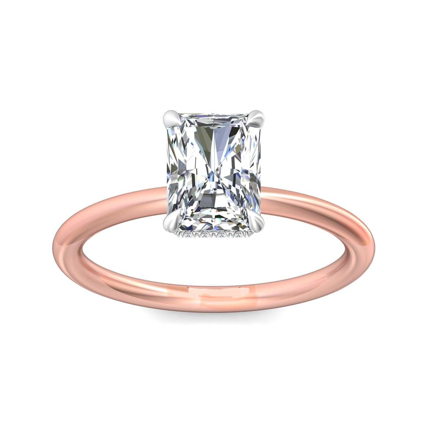 A reflection of love made to last a lifetime, this solitaire diamond engagement ring is flawlessly designed with an elegant, thin shank uplifting a single center stone and a hidden halo of diamonds nestled underneath.Solitaire Engagement Ring with Emerald Cut Diamond in a Four Claws Setting with Knife-Edge Shoulders.