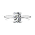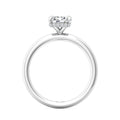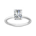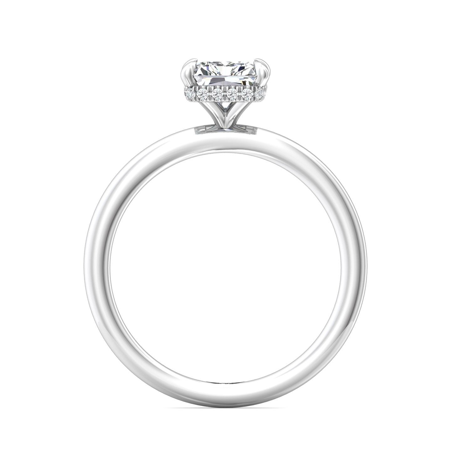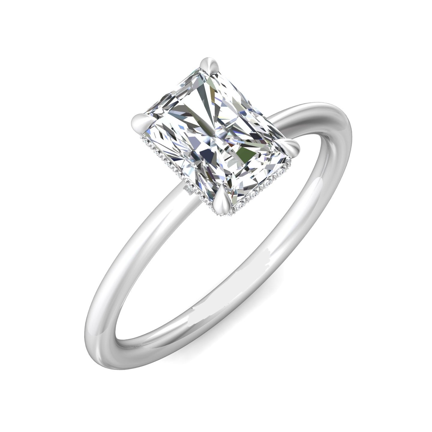 A reflection of love made to last a lifetime, this solitaire diamond engagement ring is flawlessly designed with an elegant, thin shank uplifting a single center stone and a hidden halo of diamonds nestled underneath.Solitaire Engagement Ring with Emerald Cut Diamond in a Four Claws Setting with Knife-Edge Shoulders.