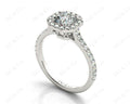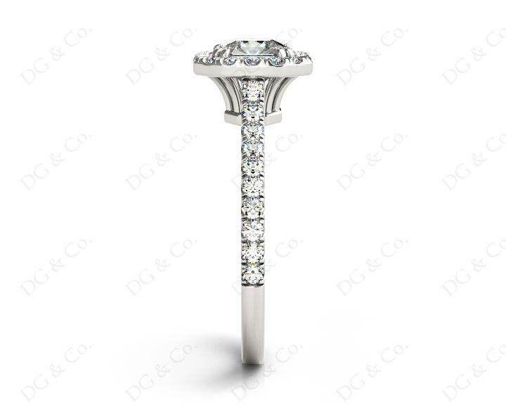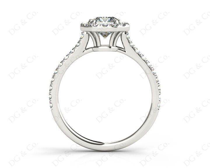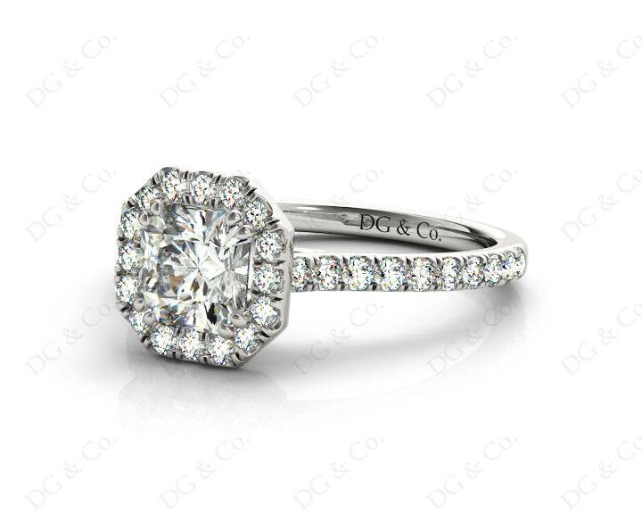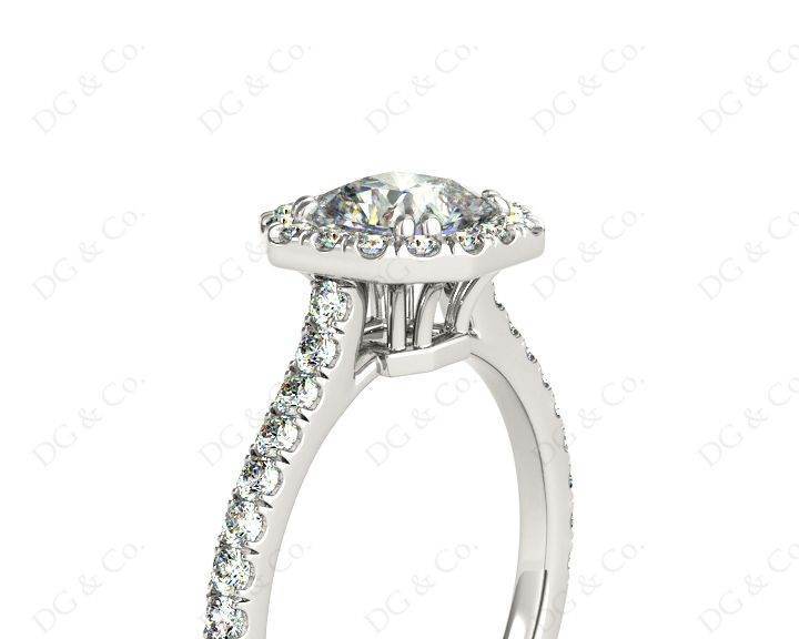 Halo Diamond Engagement Ring with Cushion Square Cut Diamond in Four claws Setting with Thirty-six round Brilliant Micro Pave Setting around the Centre Stone and Down the Shoulders.