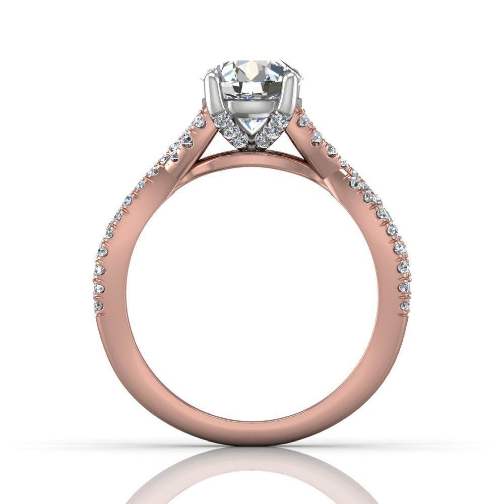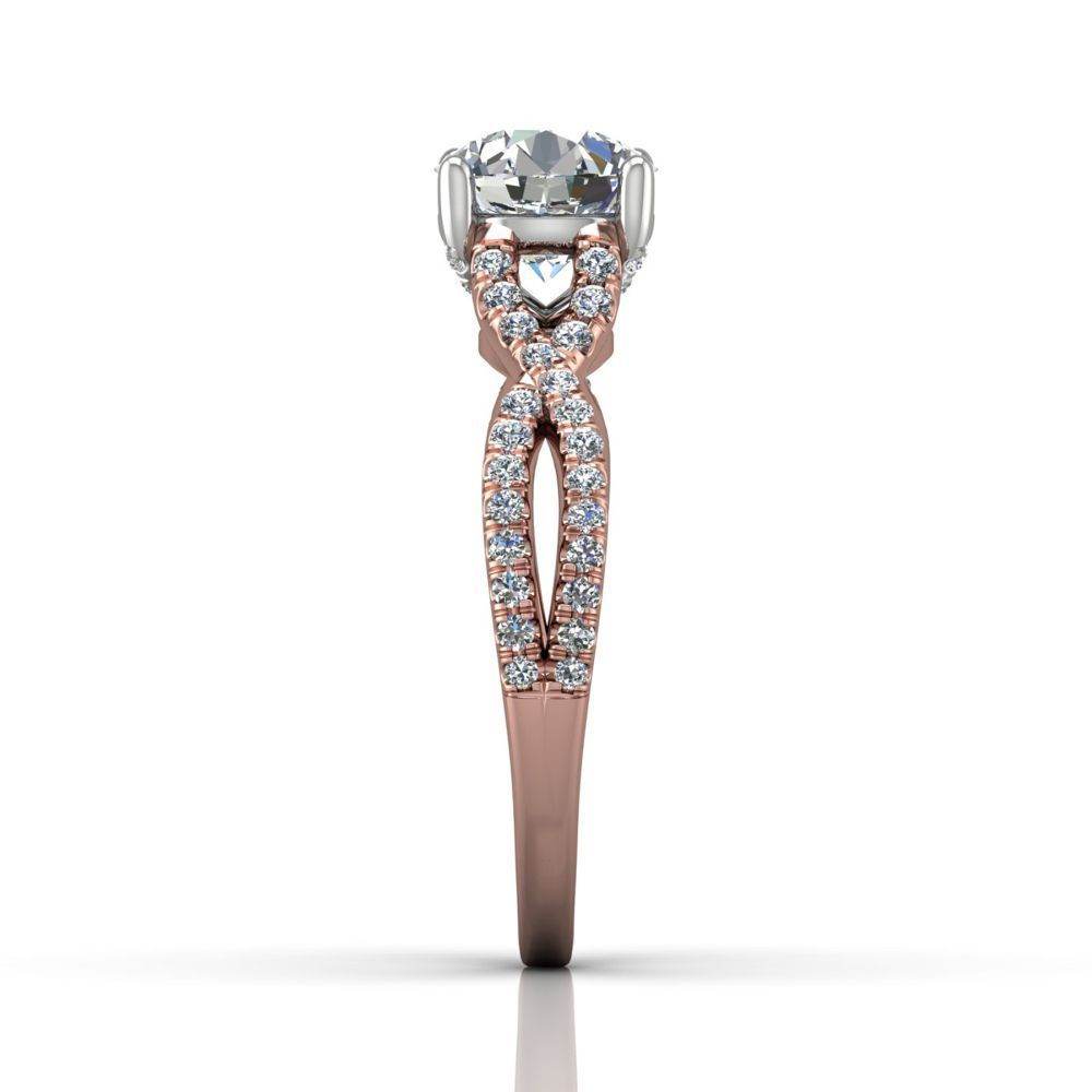 Beautiful and delicate, this 18k yellow and white gold diamond engagement ring is designed with two bands of Micro-Pave set diamonds intertwined around one another to frame your centre diamond.