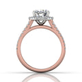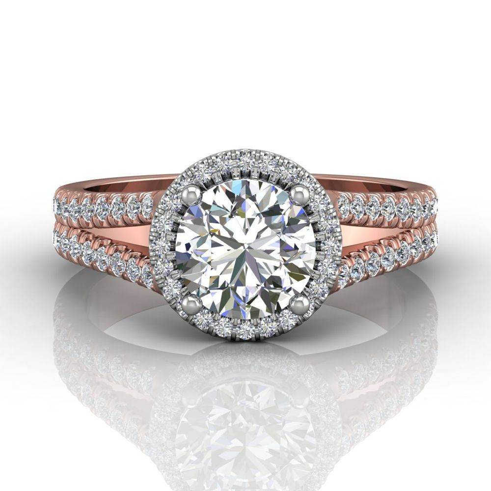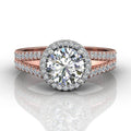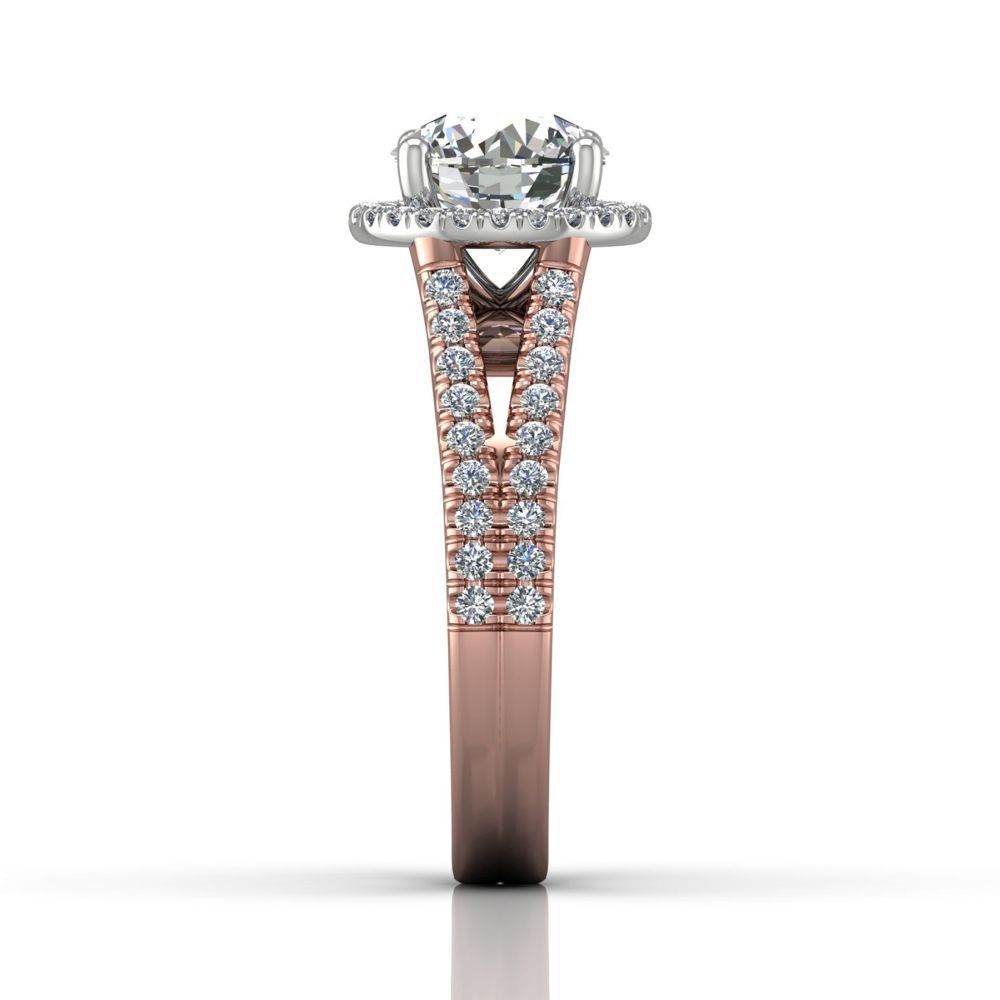 Brilliance defined, this diamond engagement ring features round diamonds set in a split shank and halo design high raised to fit a wedding band flash next to it.
