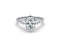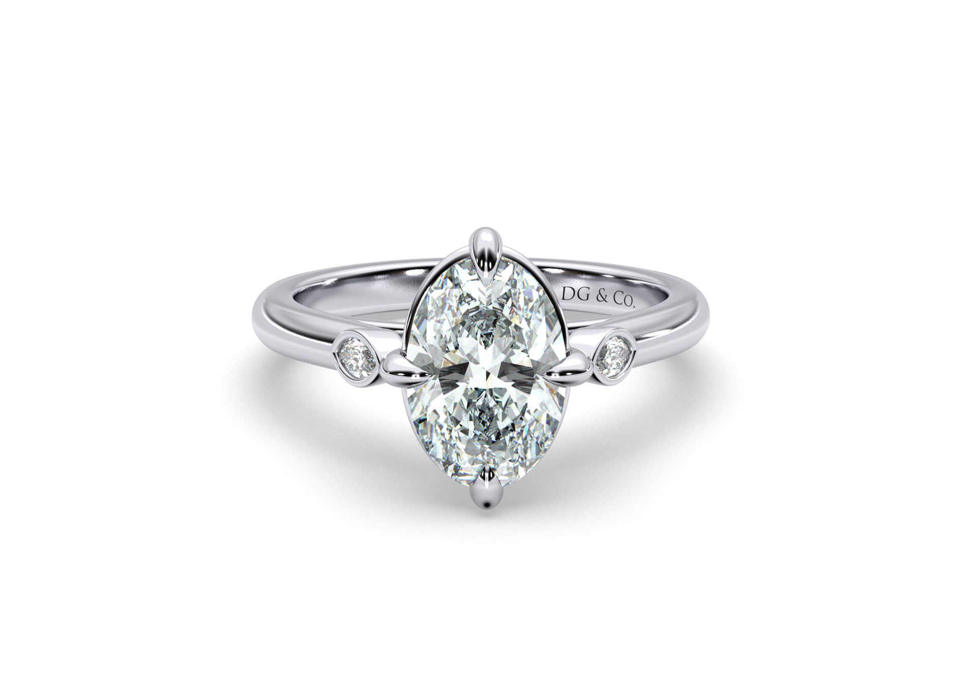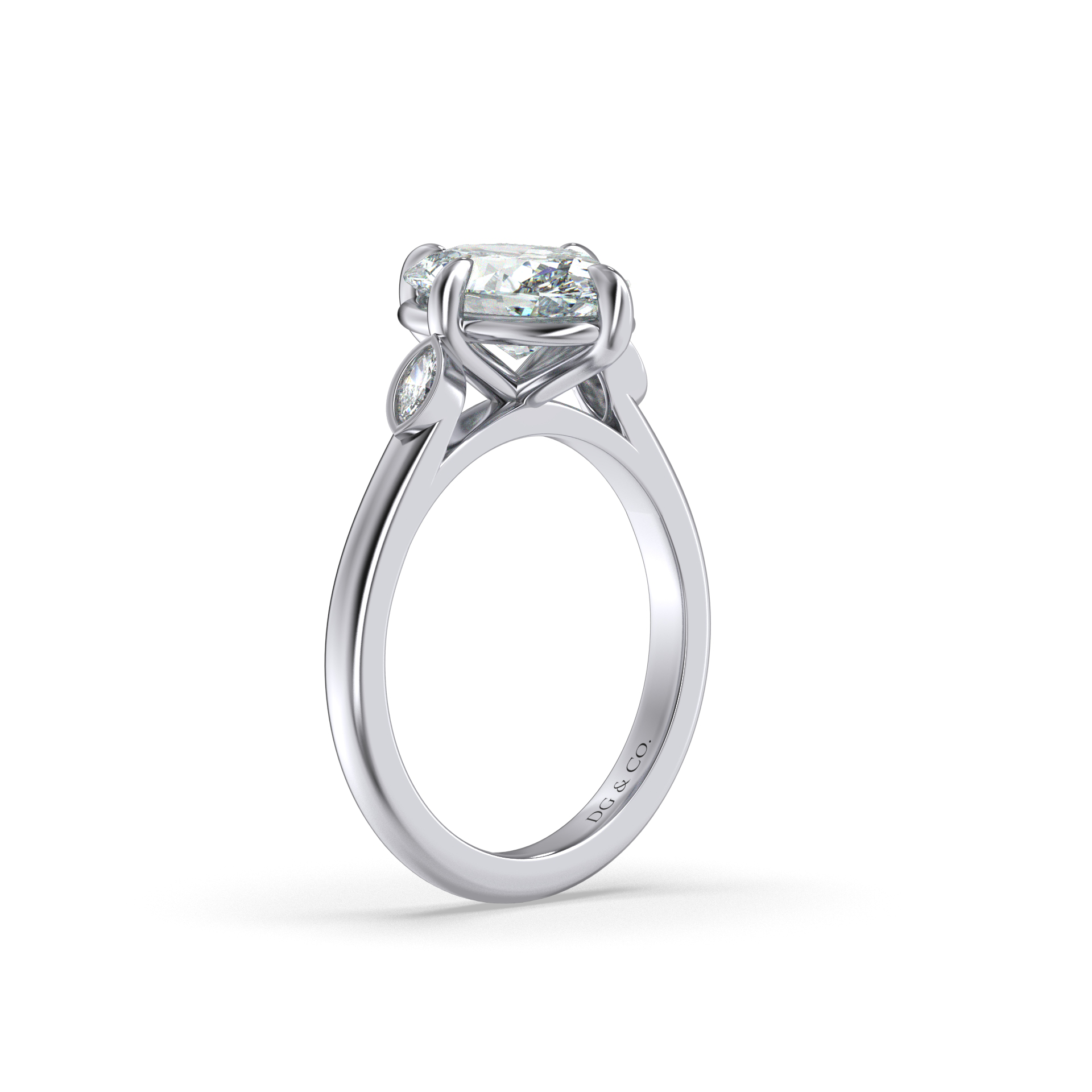 The central focus, a dazzling oval-cut diamond, is cradled in an oval bezel prong head, radiating an aura of sophistication. Flanking this centerpiece, two marquise diamonds, each embraced in a bezel setting, add a touch of regal charm to the 3-stone design. The cathedral setting elevates the stones to new heights, creating a harmonious symphony of brilliance.