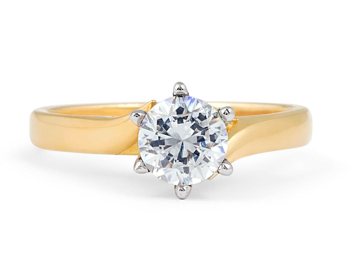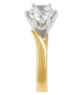 This timeless six-prongs 2-tone solitaire diamond engagement ring features a clean, classic line and delicately tapered cross over shoulders arching toward the centre diamond.