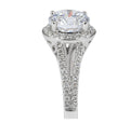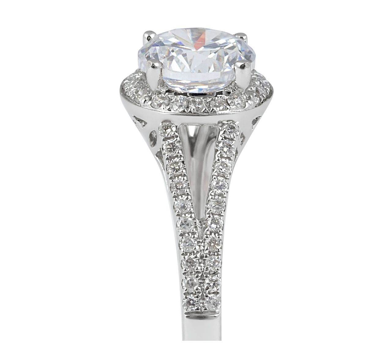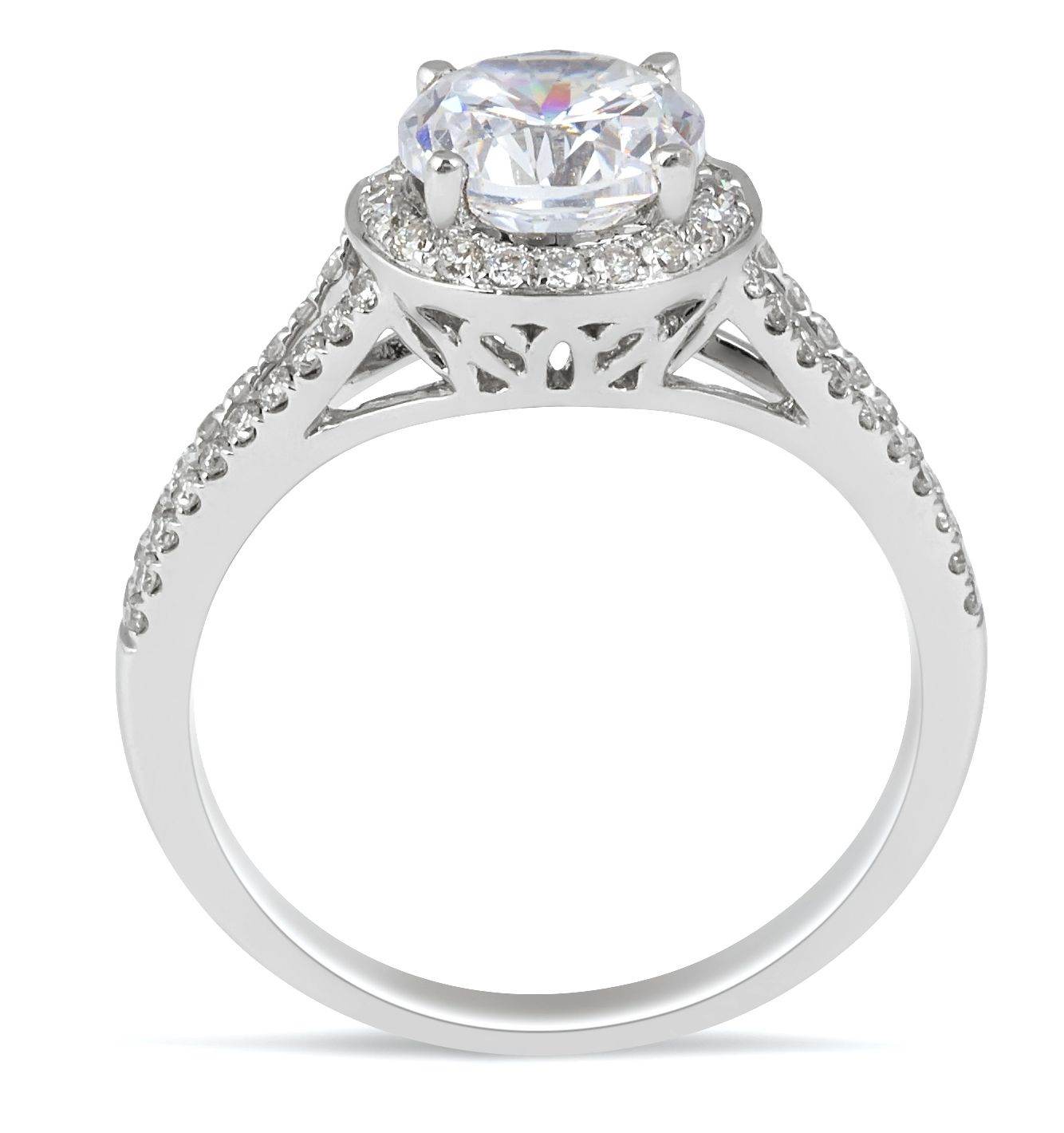 Impressively dazzling, this white gold engagement ring presents a 1 carat cut diamond centre surrounded by a sparkling halo of round diamonds and placed on a stunning diamond accented split shank. The total weight in diamonds on this breathtaking ring that defines pure elegance is 0.33 carats.