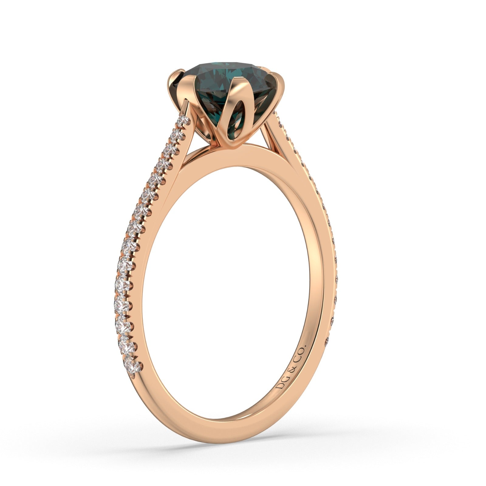Bring the drama with this six claw 18k gold ring designed with a cushion cut teal sapphire commanding the center of its silhouette. Discreet diamonds encrust the band casting brilliant white light in every direction.