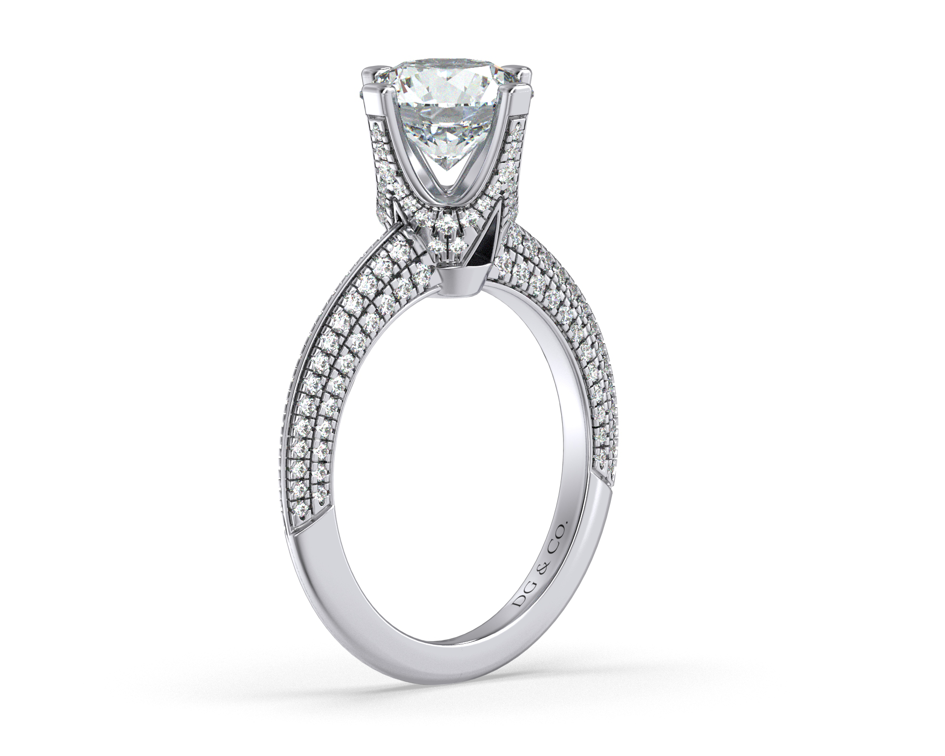 DG & Co. Jewellery Signature Style Diamond Engagement Ring. This Two rows of finely set pavé diamonds rise into a knife Edge shank to elevate the center stone while a hidden halo elegantly adorns the basket. A lavish and extraordinary ring that will not disappoint.