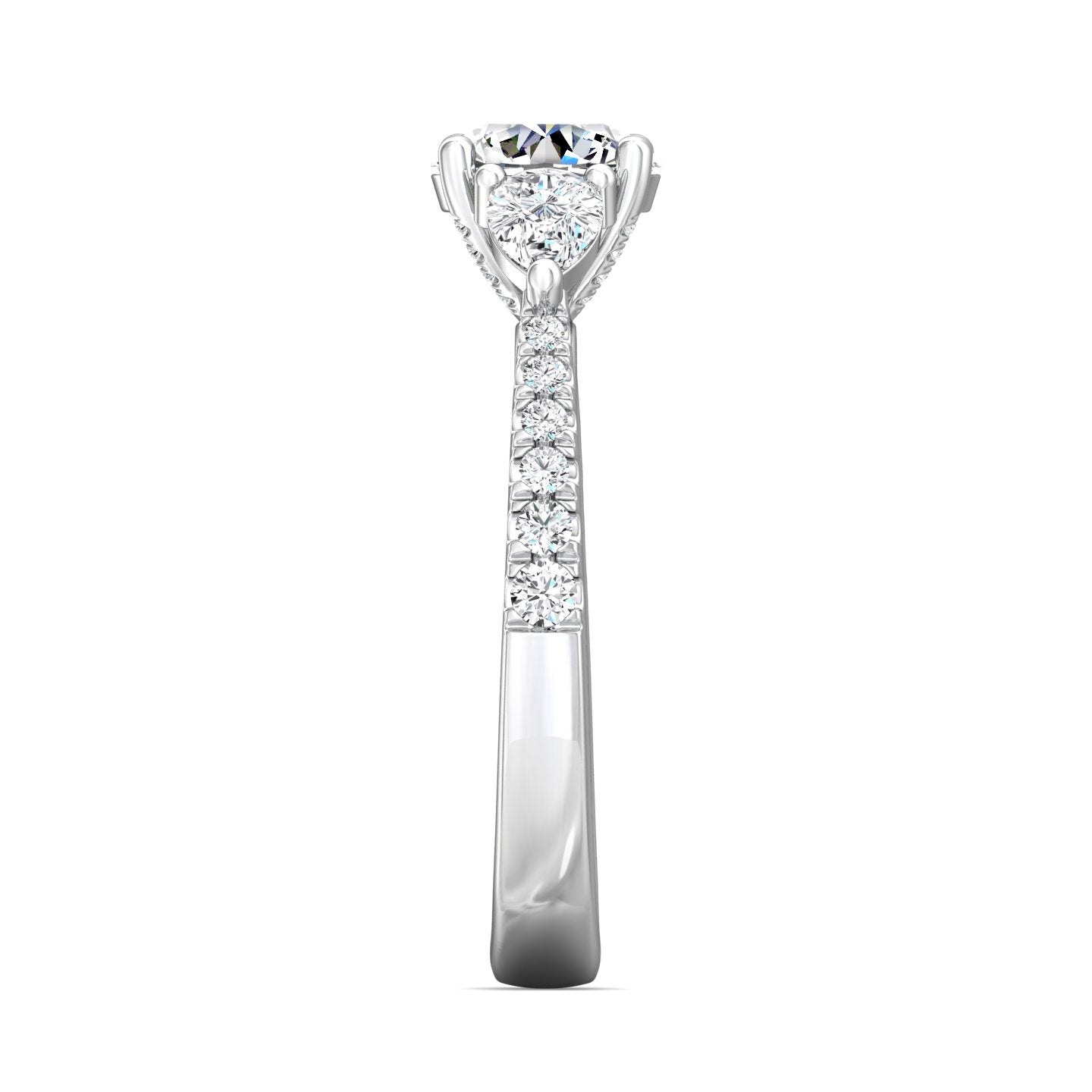 A stunning symbol of love, this engagement ring features beautiful pear-cut diamonds framing the round cut center stone, and shimmering pave-set diamonds sparkling along the shank. The design features delicate hidden halo diamonds details.
