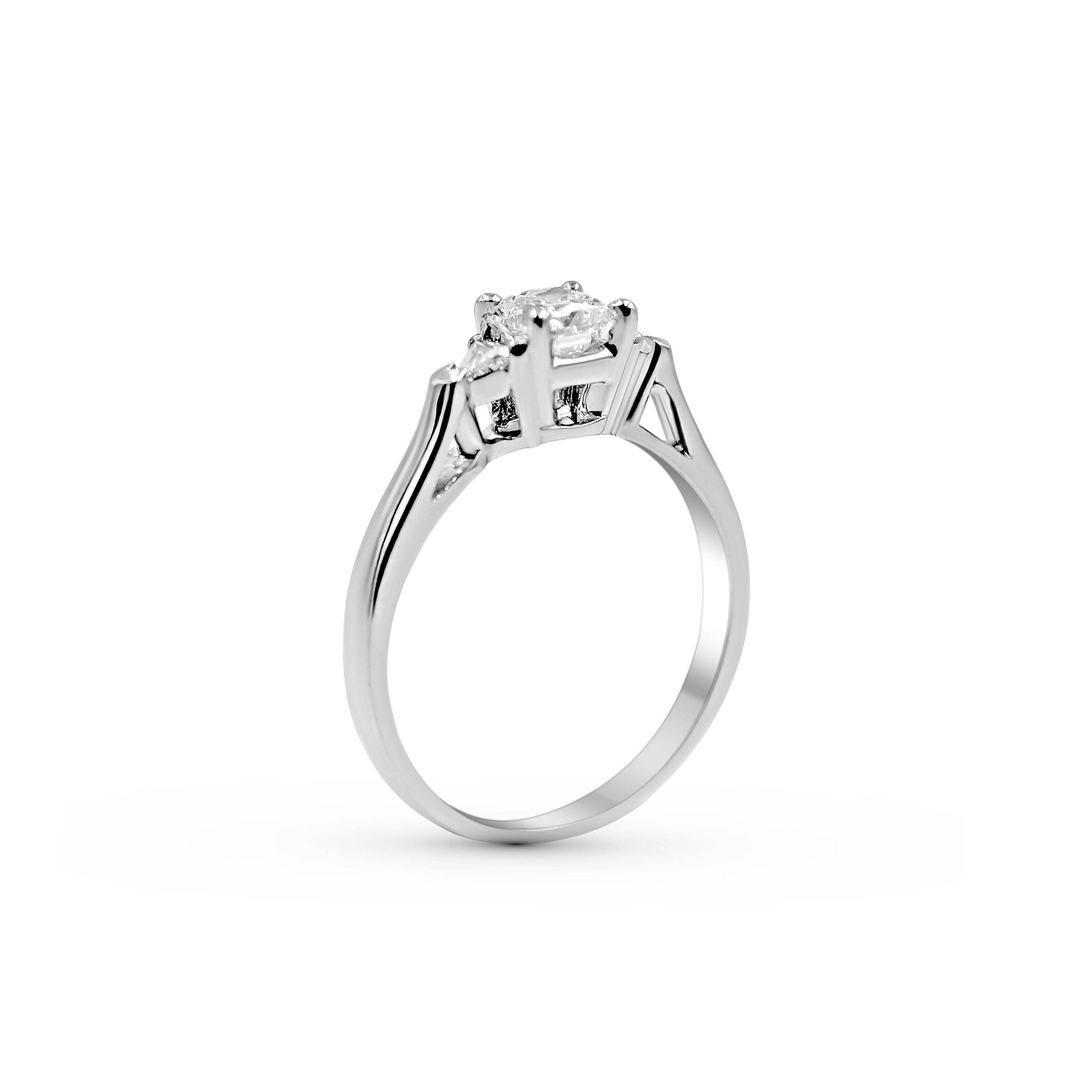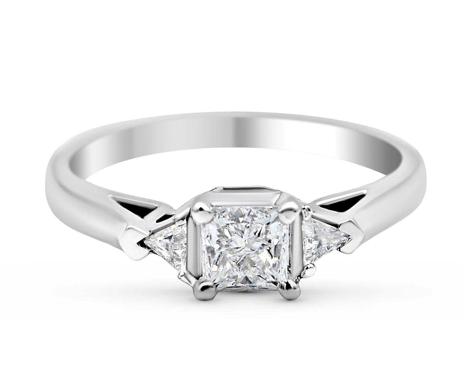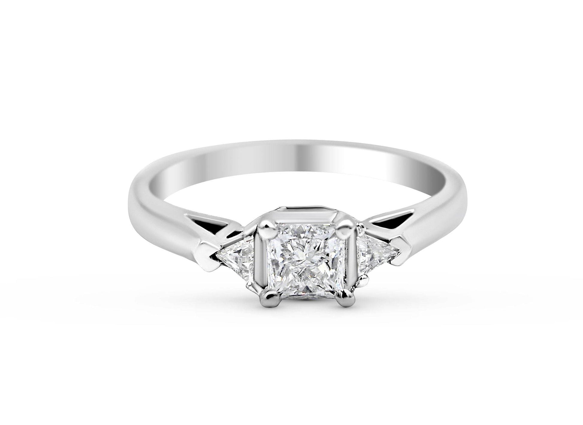 This modern and delicate diamond engagement ring set in 18K white gold features a 0.53CT princess cut centre stone and two trillion cut diamonds on both sides. The three diamonds symbolise ‘past’, ‘present’ and ‘future’. This absolutely sweet diamond ring is perfect for a lady who appreciates understated style.