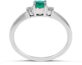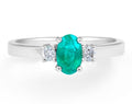 A classic ring created in 18 karat white gold The gorgeous centre stone is an oval cut emerald set with four claws and it is in a middle of two adorable sparkly round diamonds.