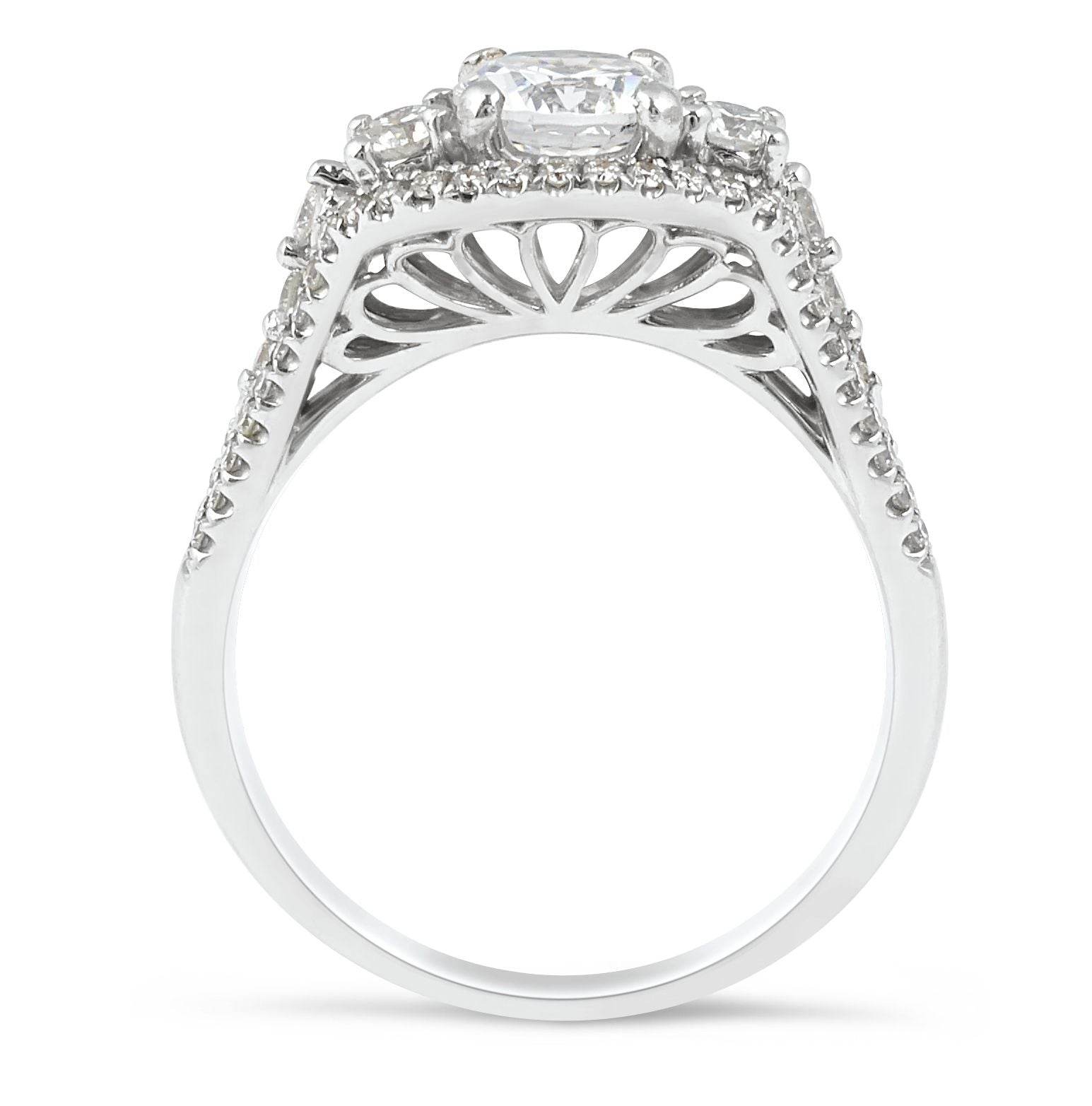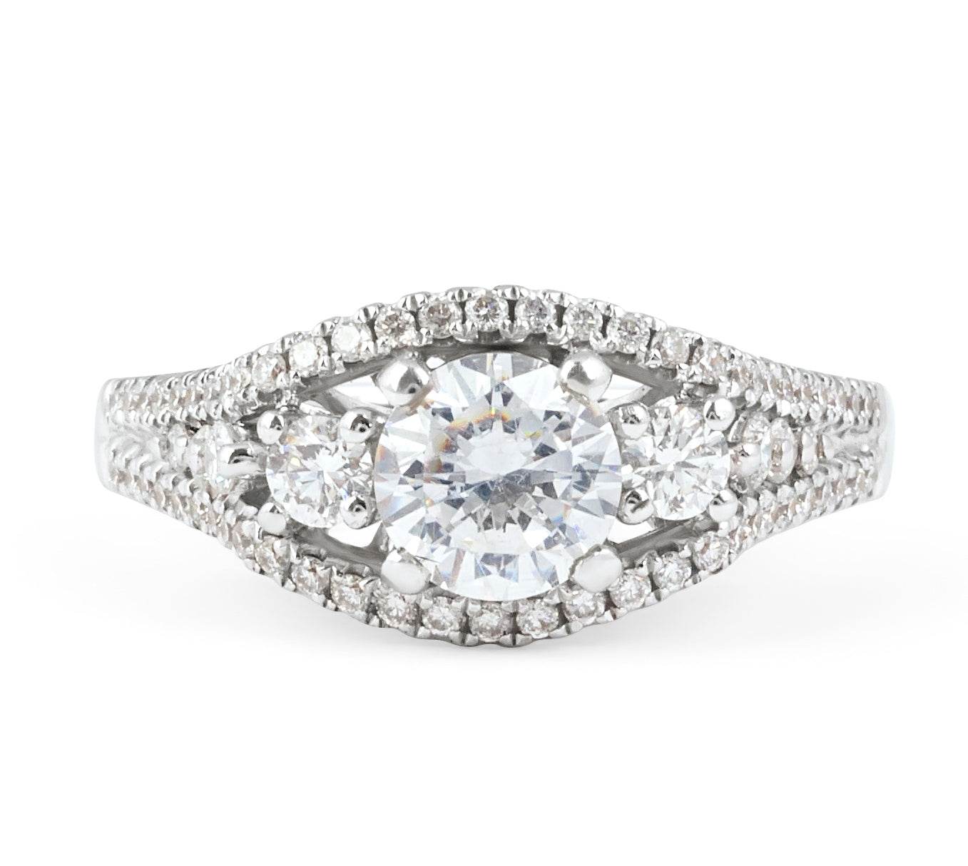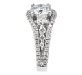 Mesmerizing ribbons of metal and pavé diamonds twist around the band and centre stone of this unique halo ring.Centre diamond 1.00 Carat F SI1 GIA Certificate side diamonds 66 diamonds 0.52 carat.