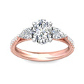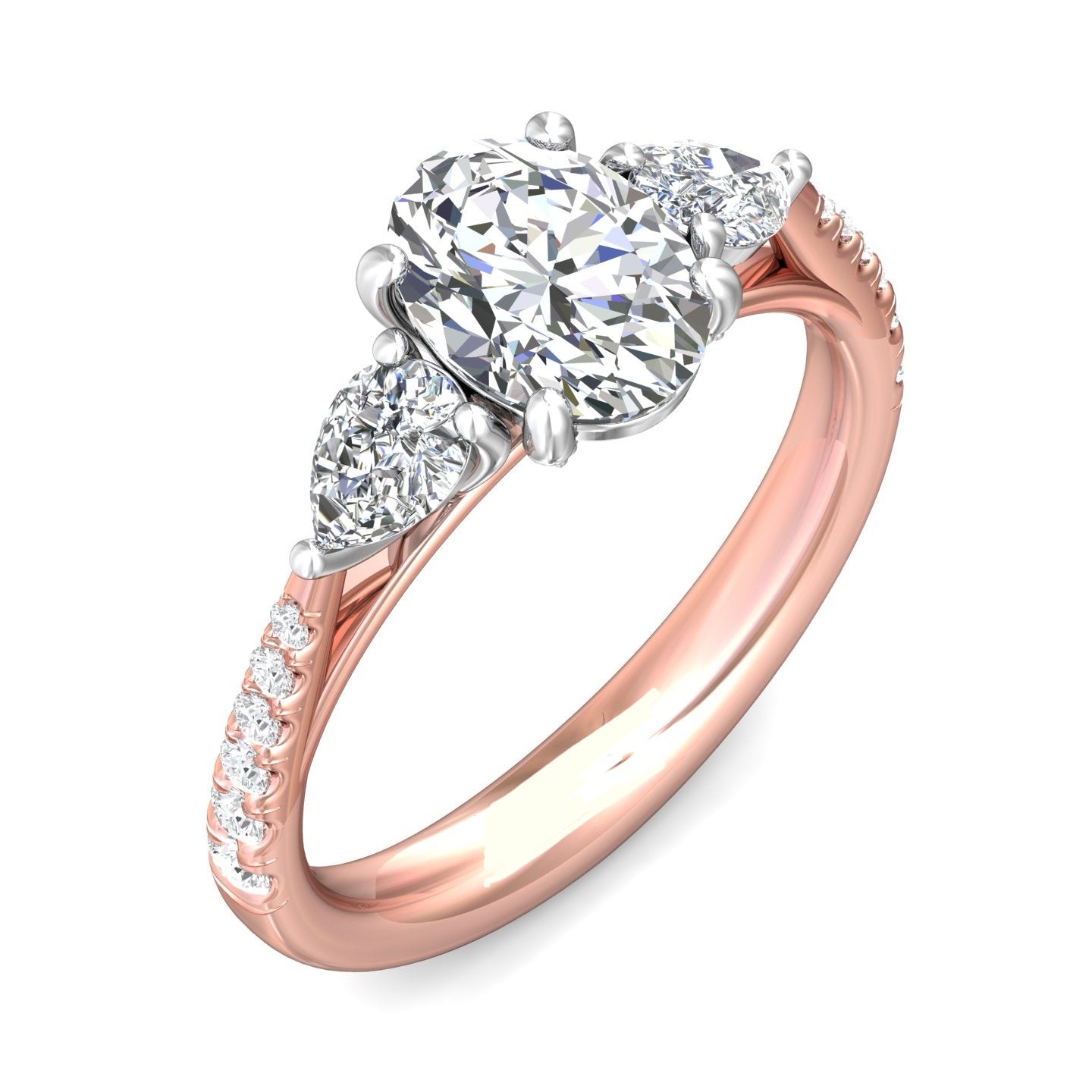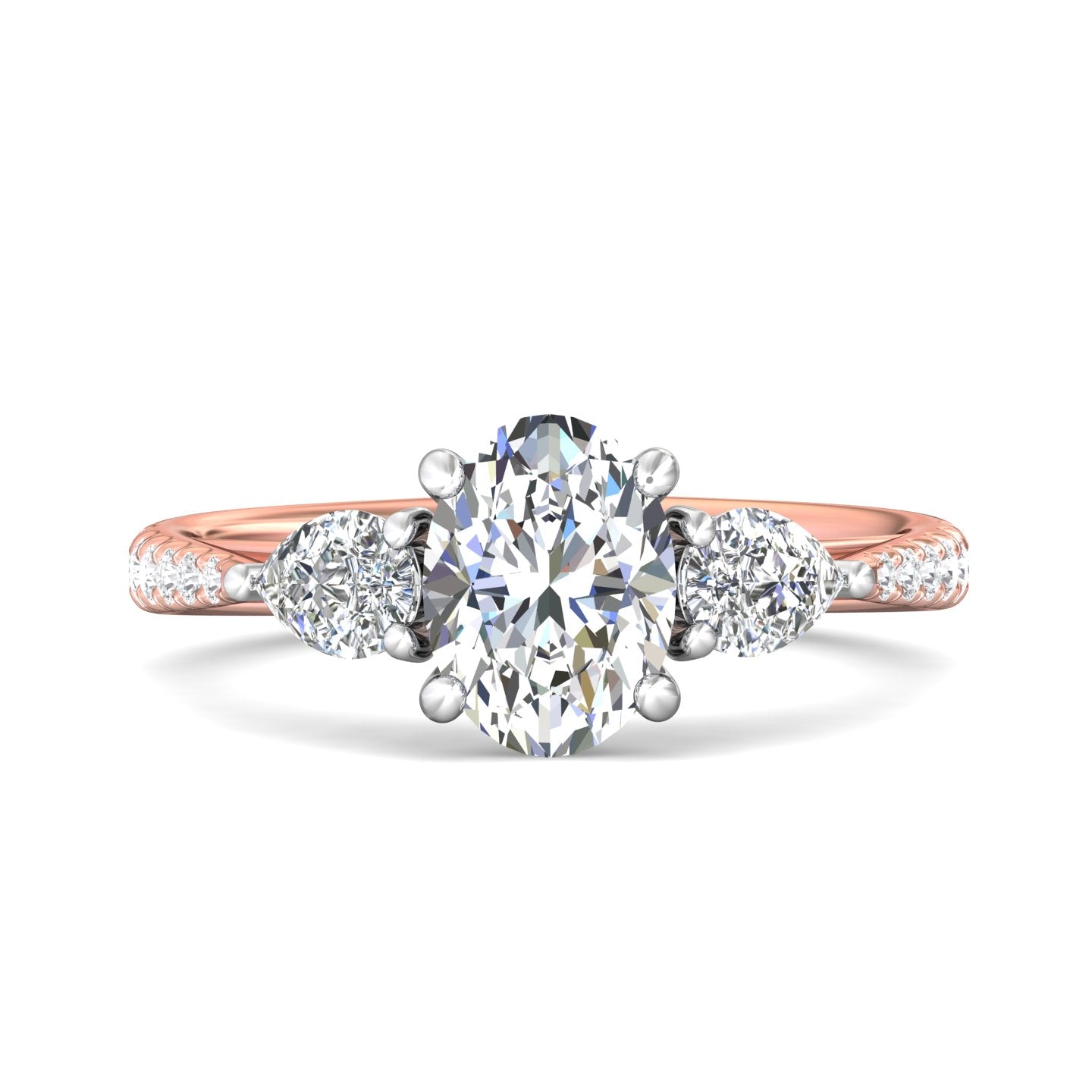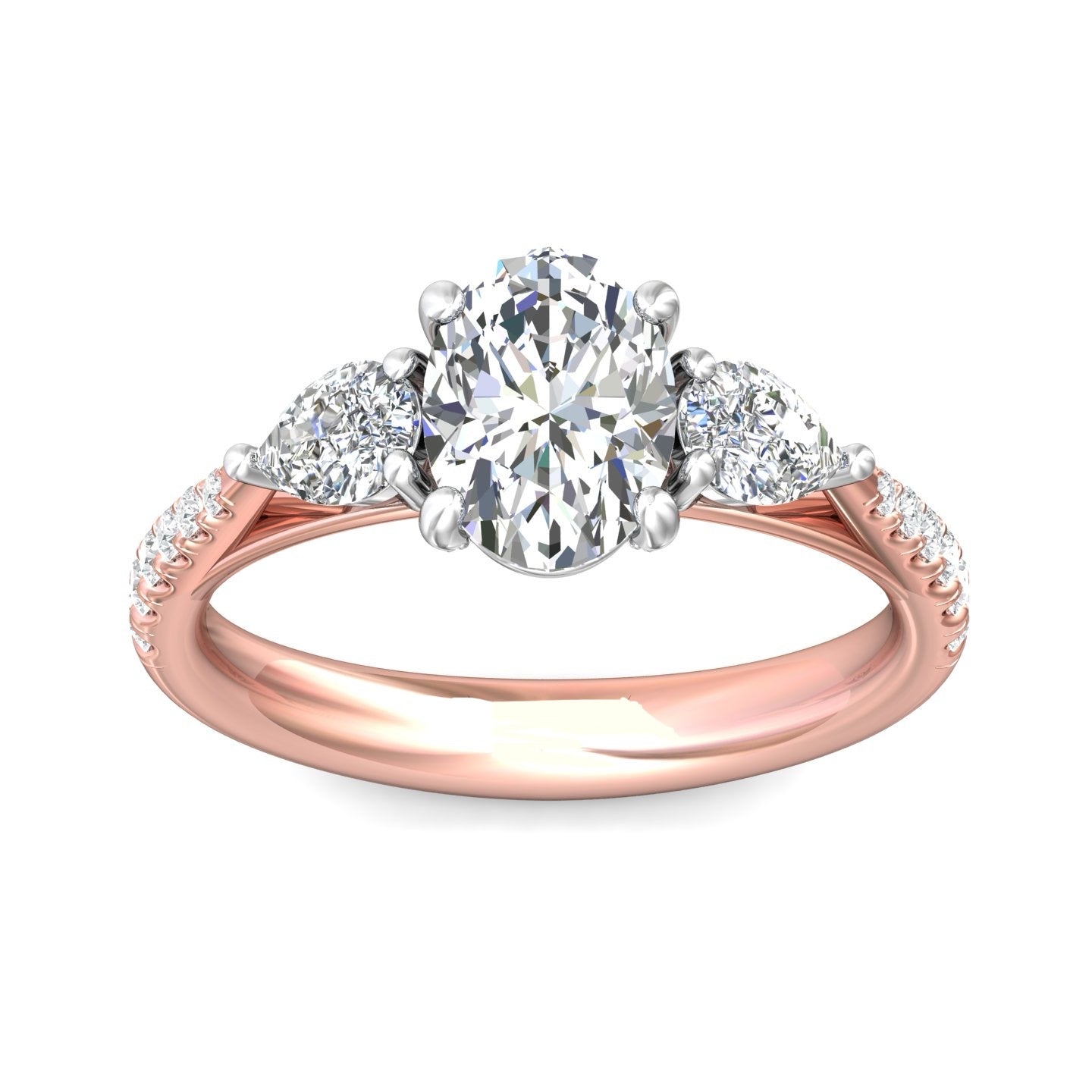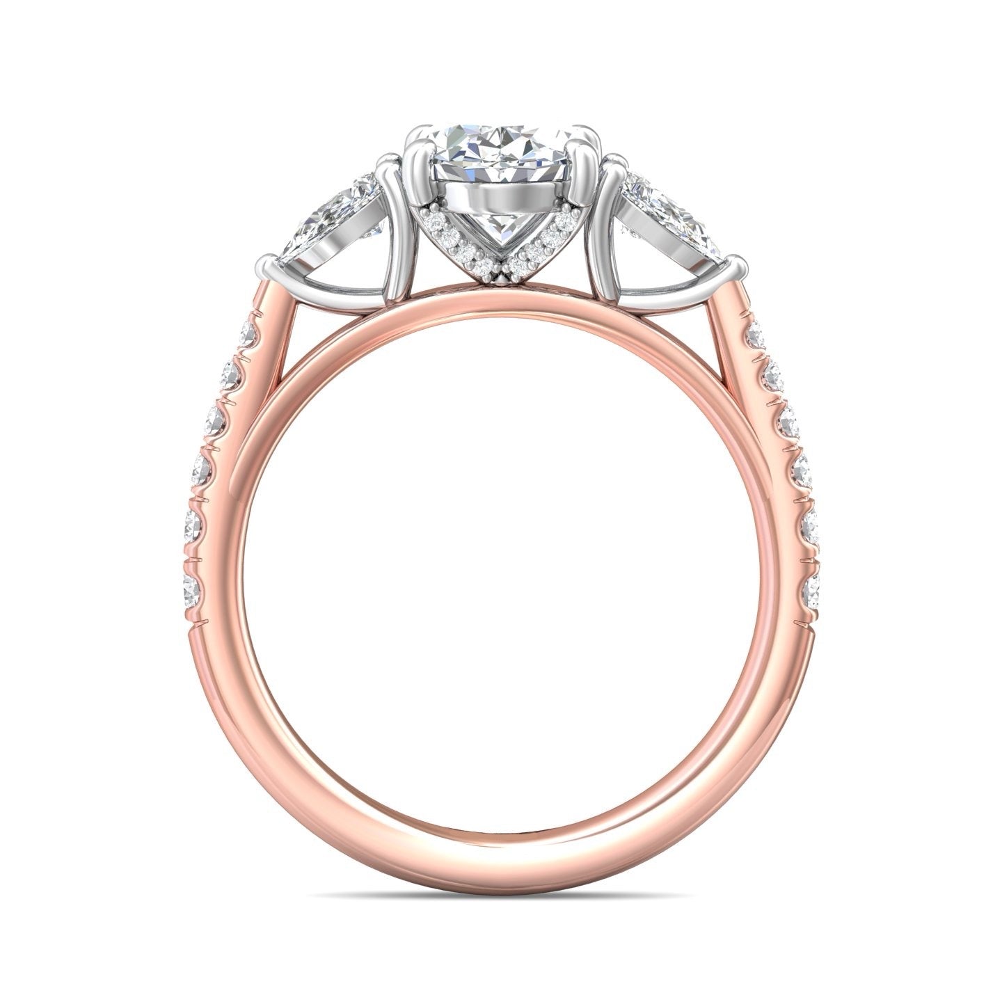 A stunning symbol of love, this trilogy's engagement ring features beautiful pear-cut diamonds framing the center stone, and shimmering pave-set diamonds sparkling along the shank. The design features delicate detail in the profile, with hidden diamonds and modern-inspired detail.