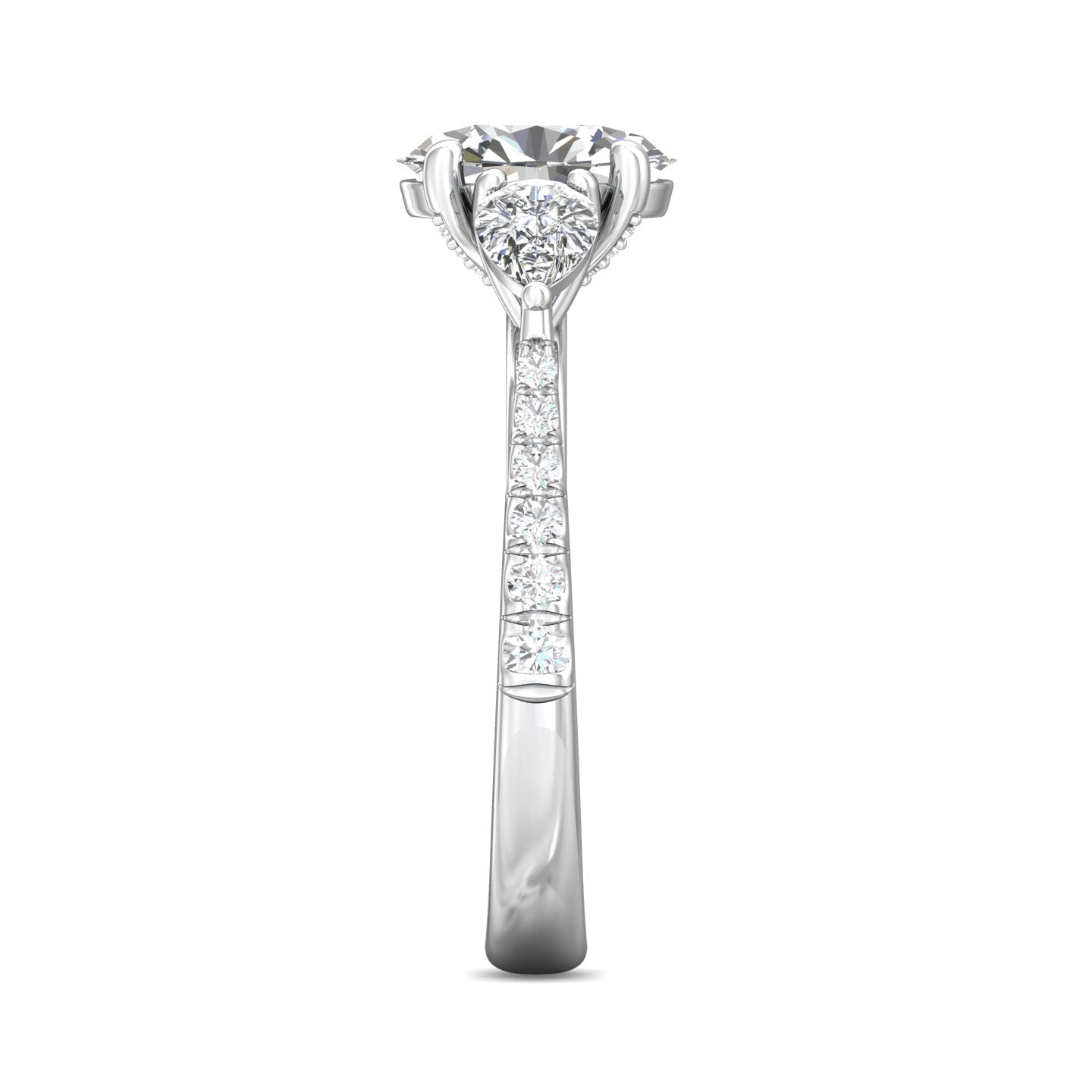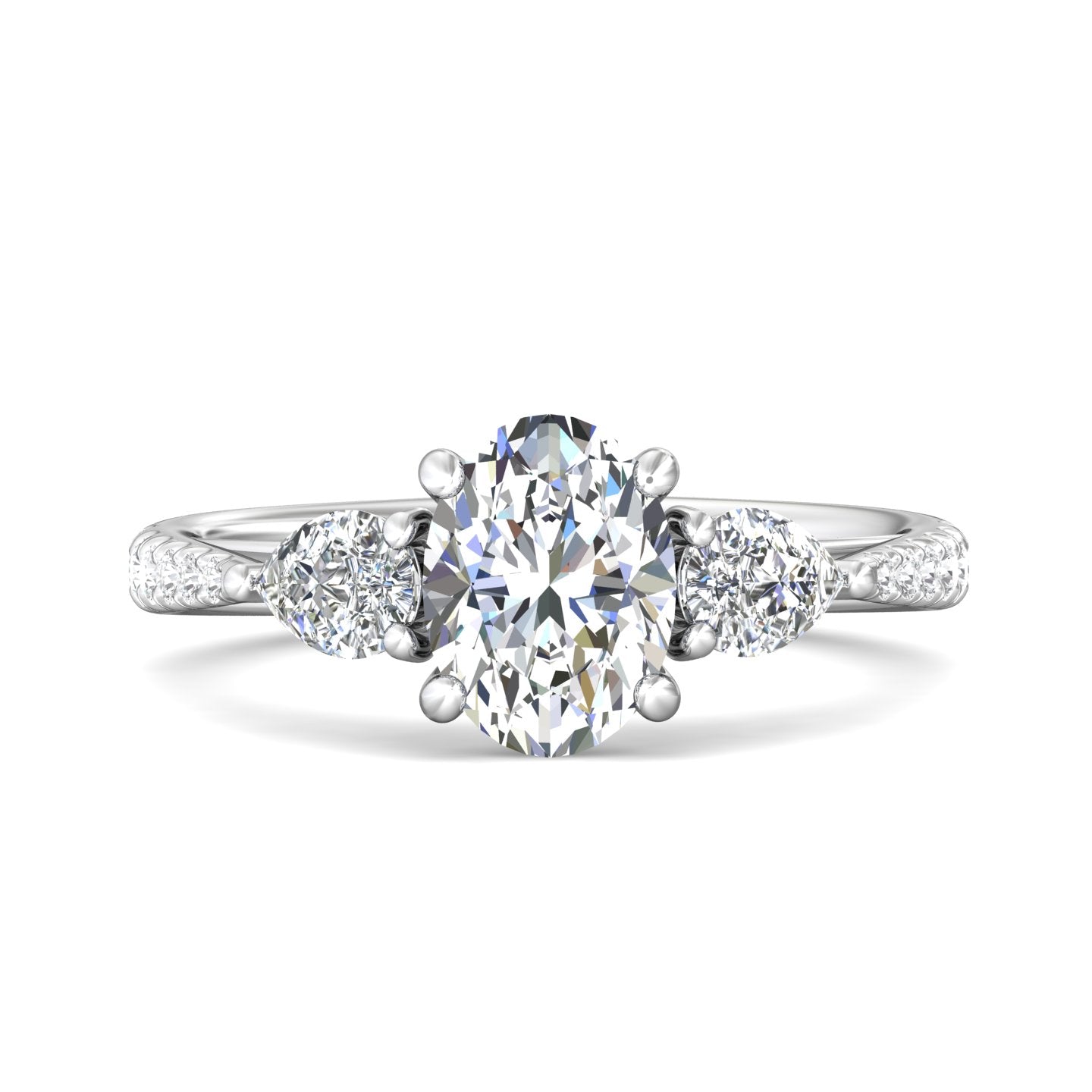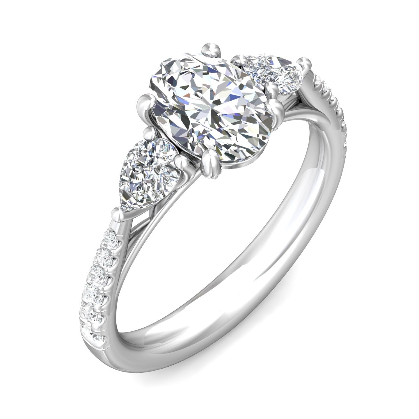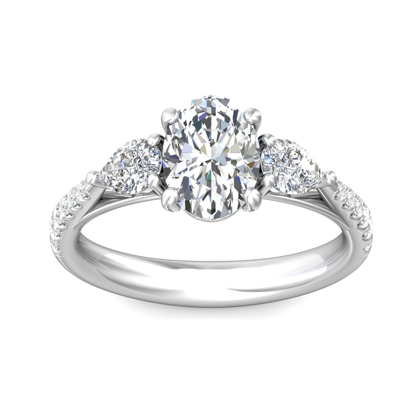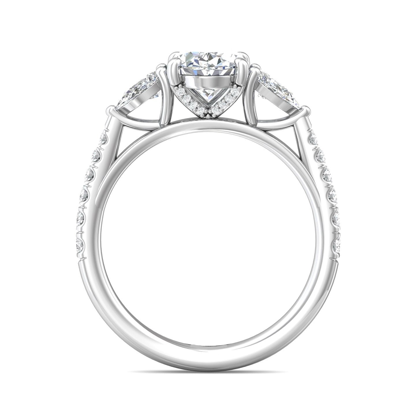 A stunning symbol of love, this trilogy's engagement ring features beautiful pear-cut diamonds framing the center stone, and shimmering pave-set diamonds sparkling along the shank. The design features delicate detail in the profile, with hidden diamonds and modern-inspired detail.