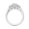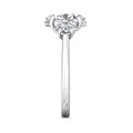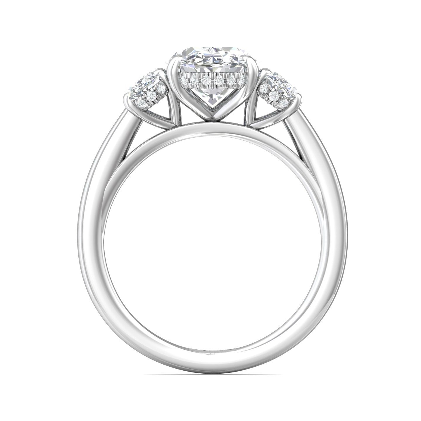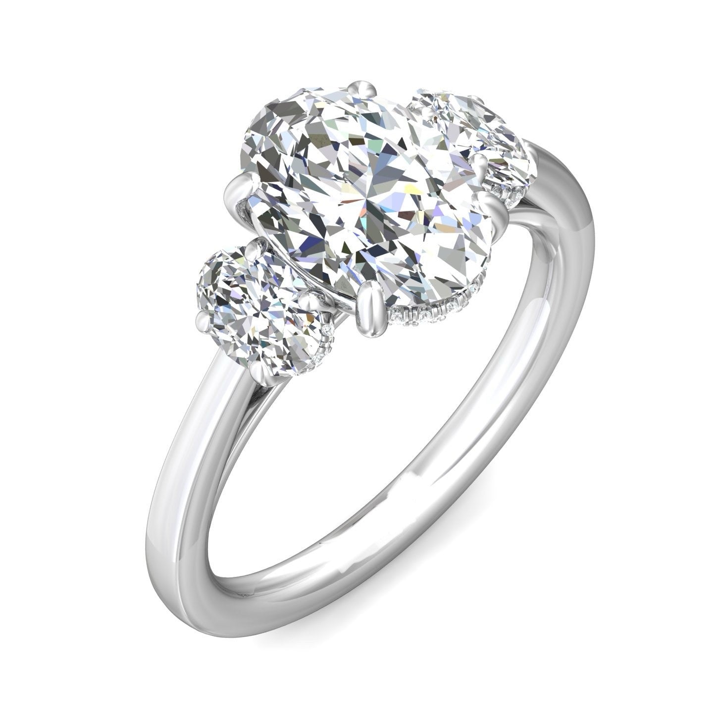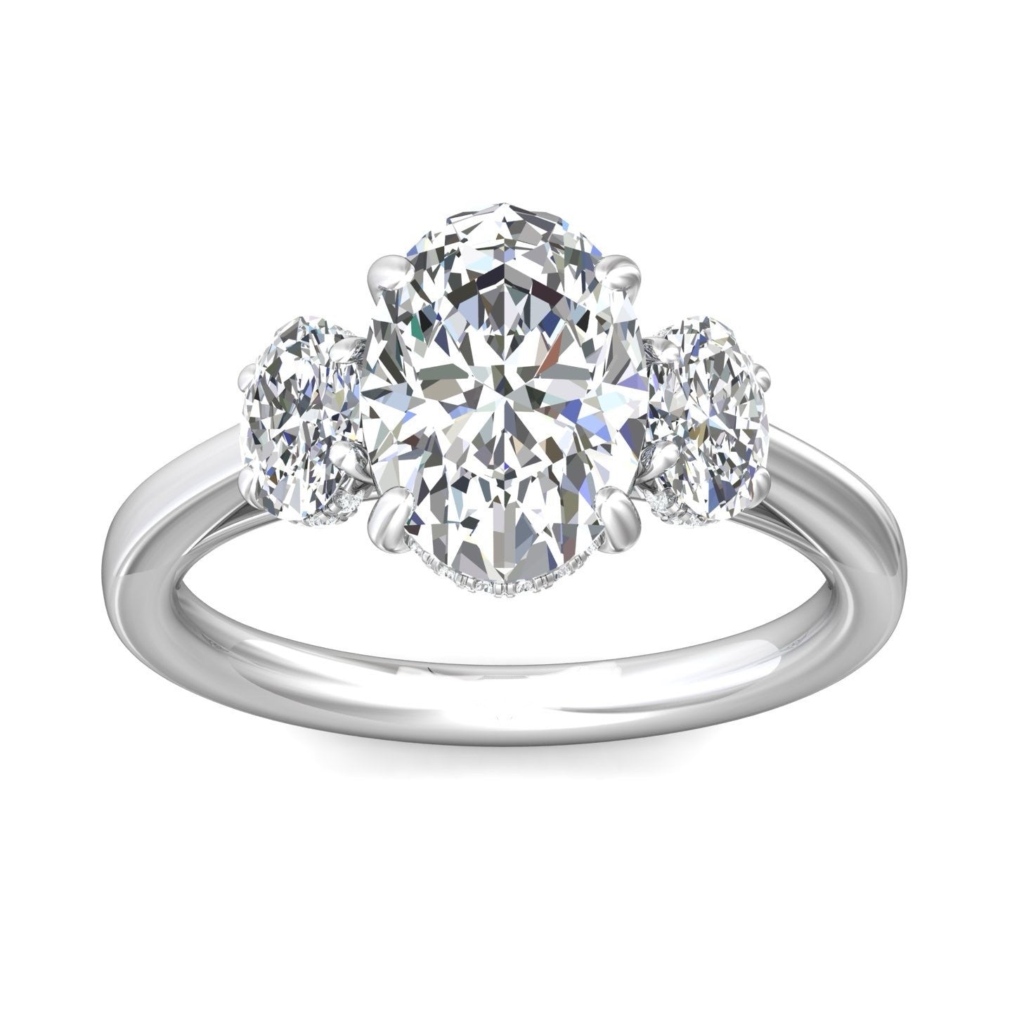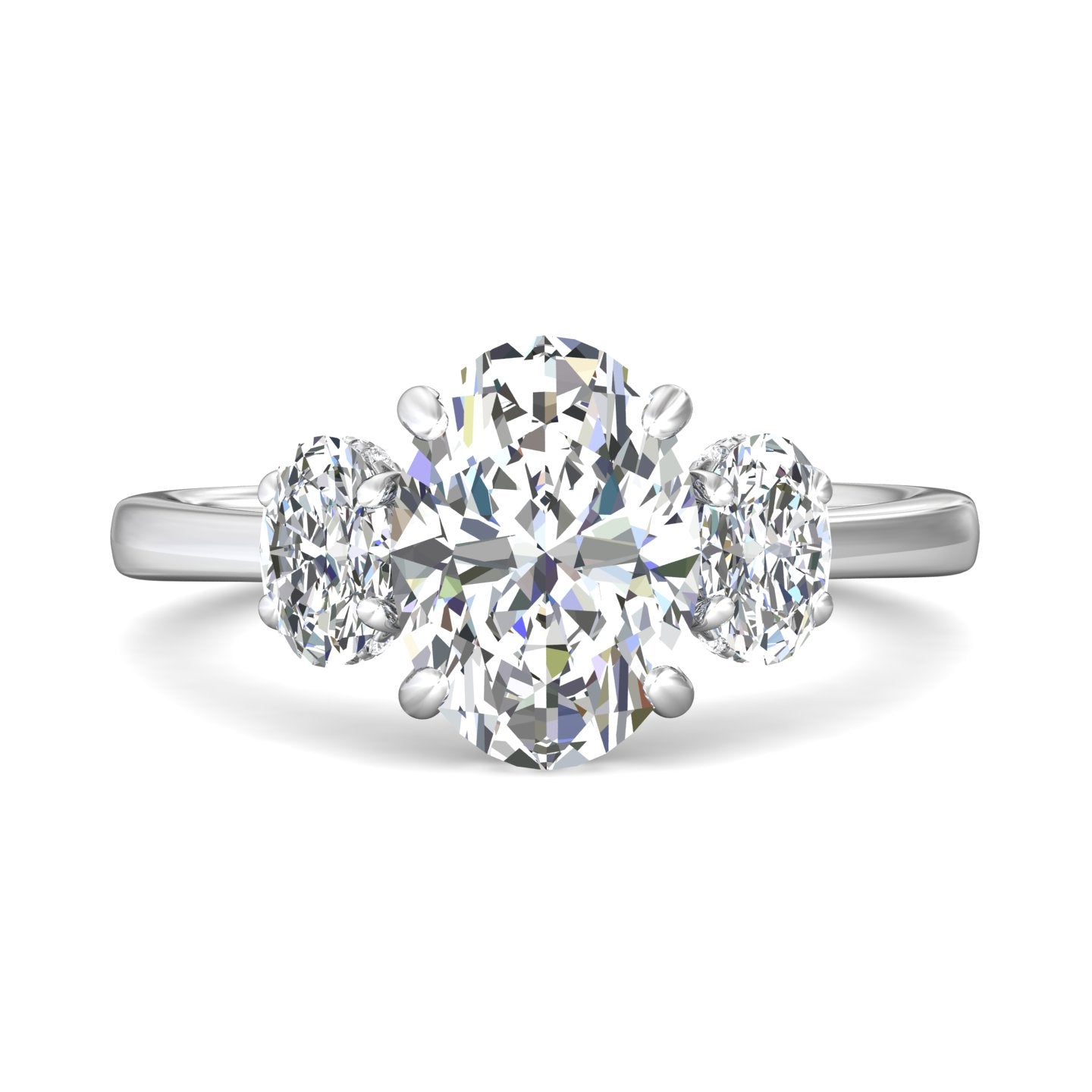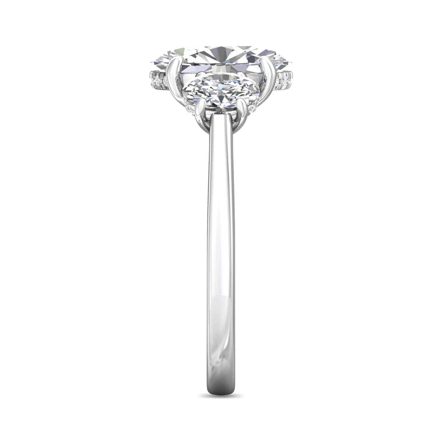 Timeless design and refined details come together to create this harmonious and balanced of this engagement ring crowned with a brilliant center stone framed by two oval diamonds.