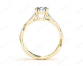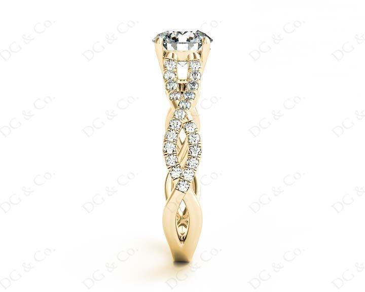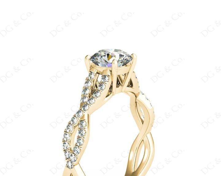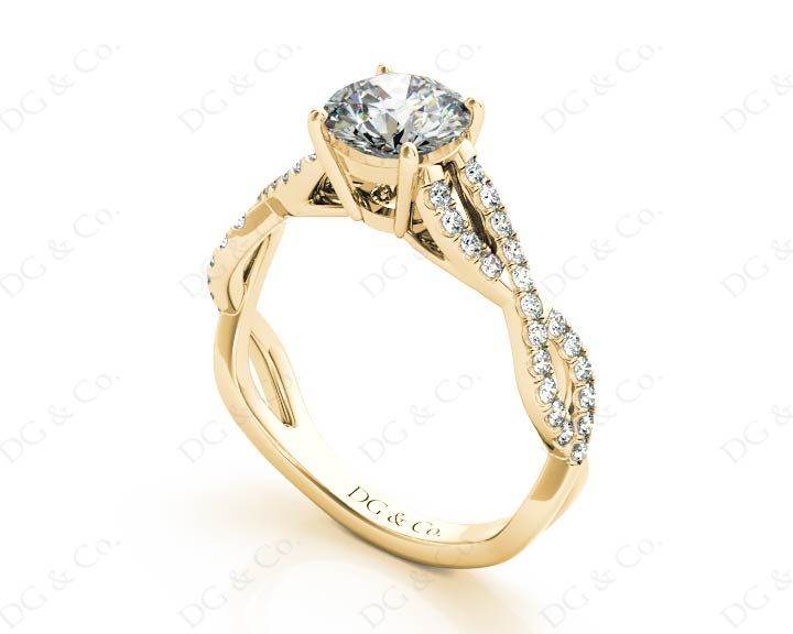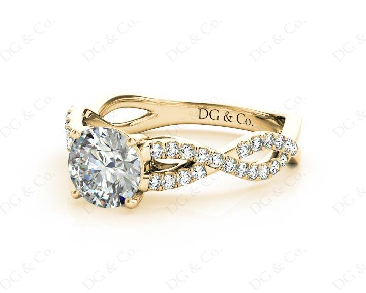 Diamond Engagement Ring with with a Round Cut Diamond and Pave Set Diamonds Down the Shoulders on a Split Twisted Band.