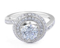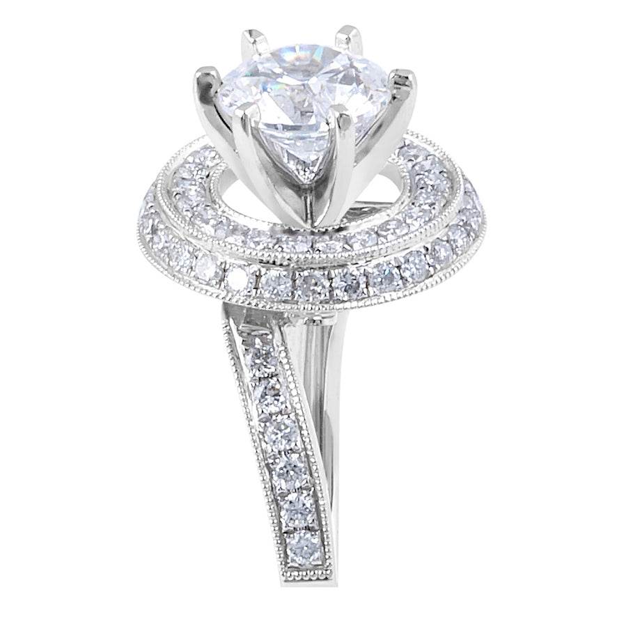 This vintage 18 Karat White Gold Ring is set with a striking sparkly 1 carat centre diamond that is E color, VS2 clarity with Tripple Excellent GIA Certificate. The stunning diamond halo and side diamonds are all marticulously grain set to give the ring an elegant and classic finish. A great choice for those wanting a classic and timeless design.