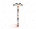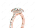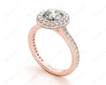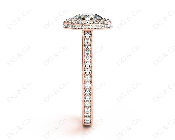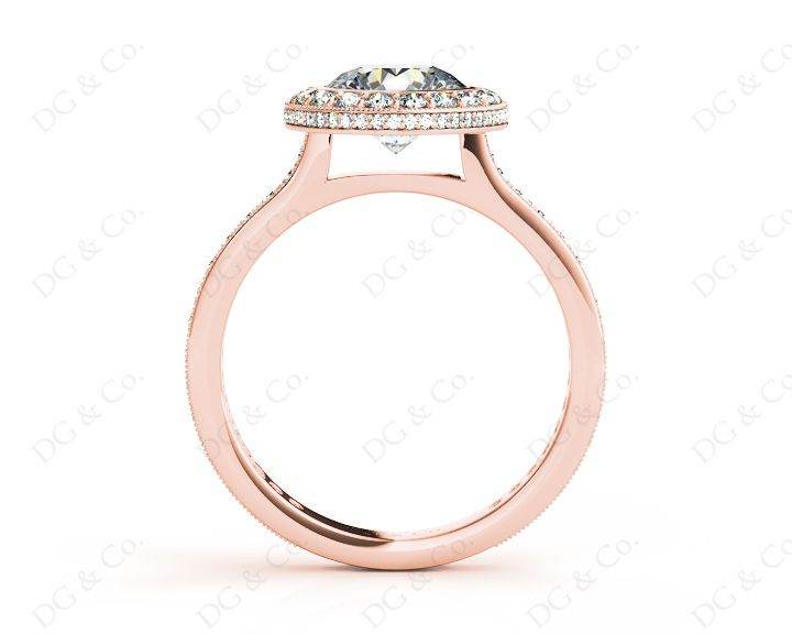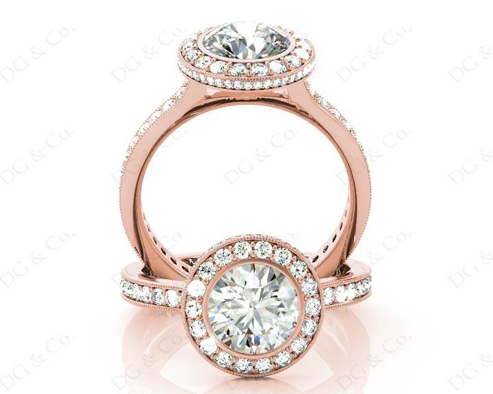 Halo Engagement Ring with a Round Cut Diamond in a Bezel Set with Small Round Cut Diamonds Grain Set around the Centre Stone and Down the Shoulders.