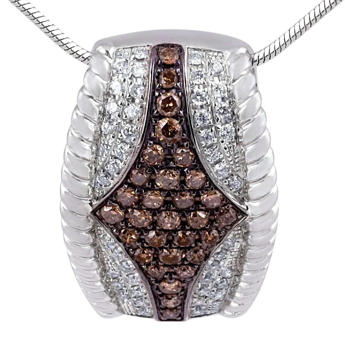 Glamour and style meet edgy sophistication. A classic design pendant featuring micro pave set white and brown diamonds to give a timeless appeal, framed in 14 Karat white gold.
