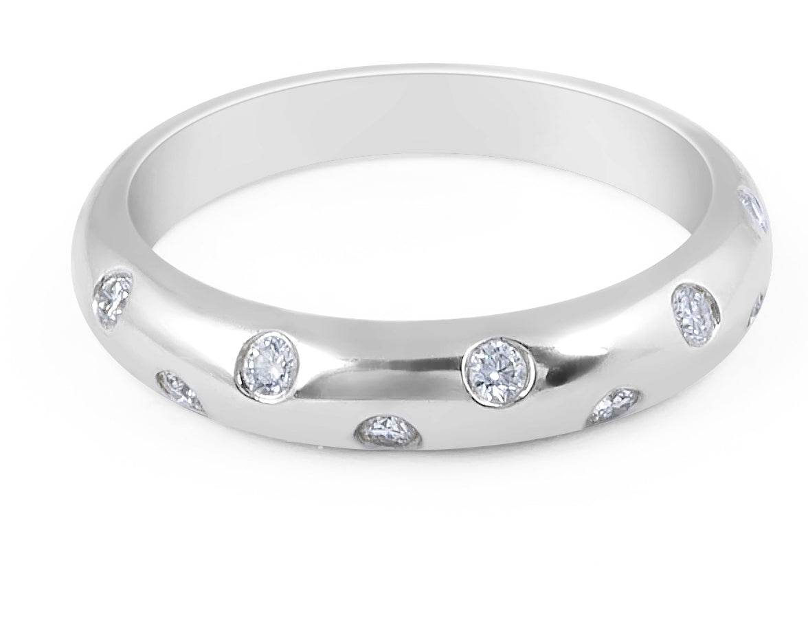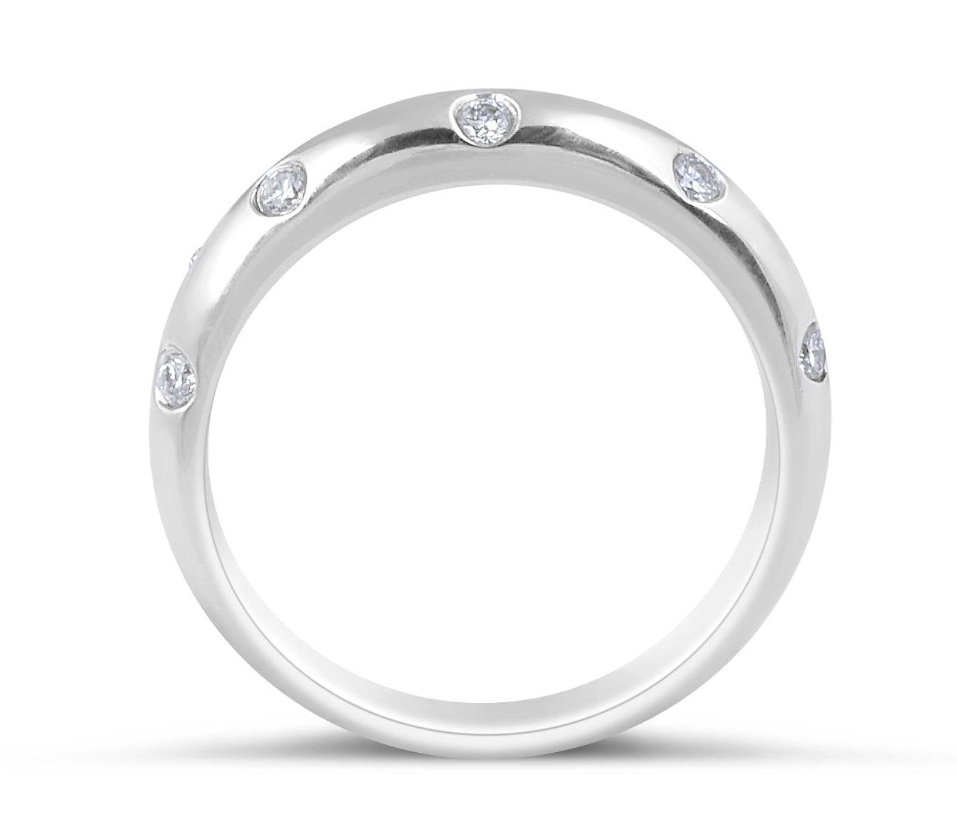 Modern design 18 Karat white gold diamond wedding band intriguingly set with 10 sparkling round brilliant diamonds totalling 0.22 Carat. The zig zage diamond setting and solid band gives the ring a compelling and modern finish making it the perfect ring for the discerning ladies or gents looking for a modern yet classic design.