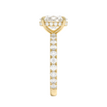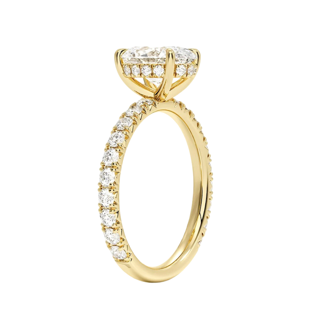 Gorgeous pave trail along the shank of this classic engagement ring, adding bold sparkle. The design elegantly holds the oval cut centre stone aloft with elegant romance.